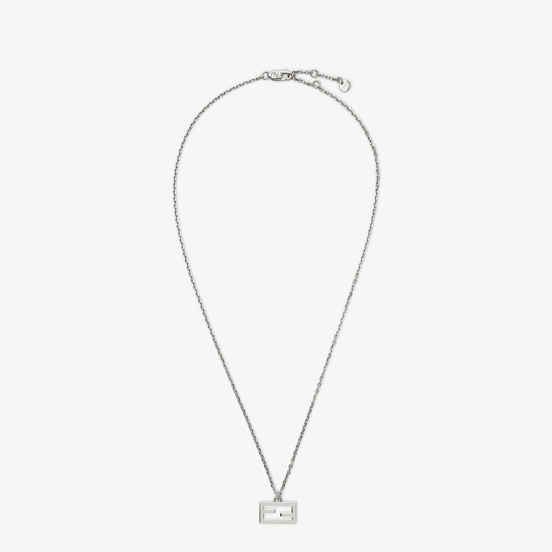 Fine chain-link necklace with FF Baguette pendant. Made of metal with a palladium finish. Made in Italy Composition: 100% brass Product Code: 7AJ891B08F0TH0 Product Care: The product you have purchased may be embellished with a precious metal top or varnish and may also feature appliques, gemstones (in various shades of the same color), crystals, plexiglass or resin. The mixture of materials and the special details give this product its unique character. To best maintain the product’s appearance over time, avoid contact with sea water, spa water, lacquers, perfumes, solvents, chemicals and abrasive materials. If necessary, clean with water and a neutral soap and/or polish with a dry microfiber cloth.