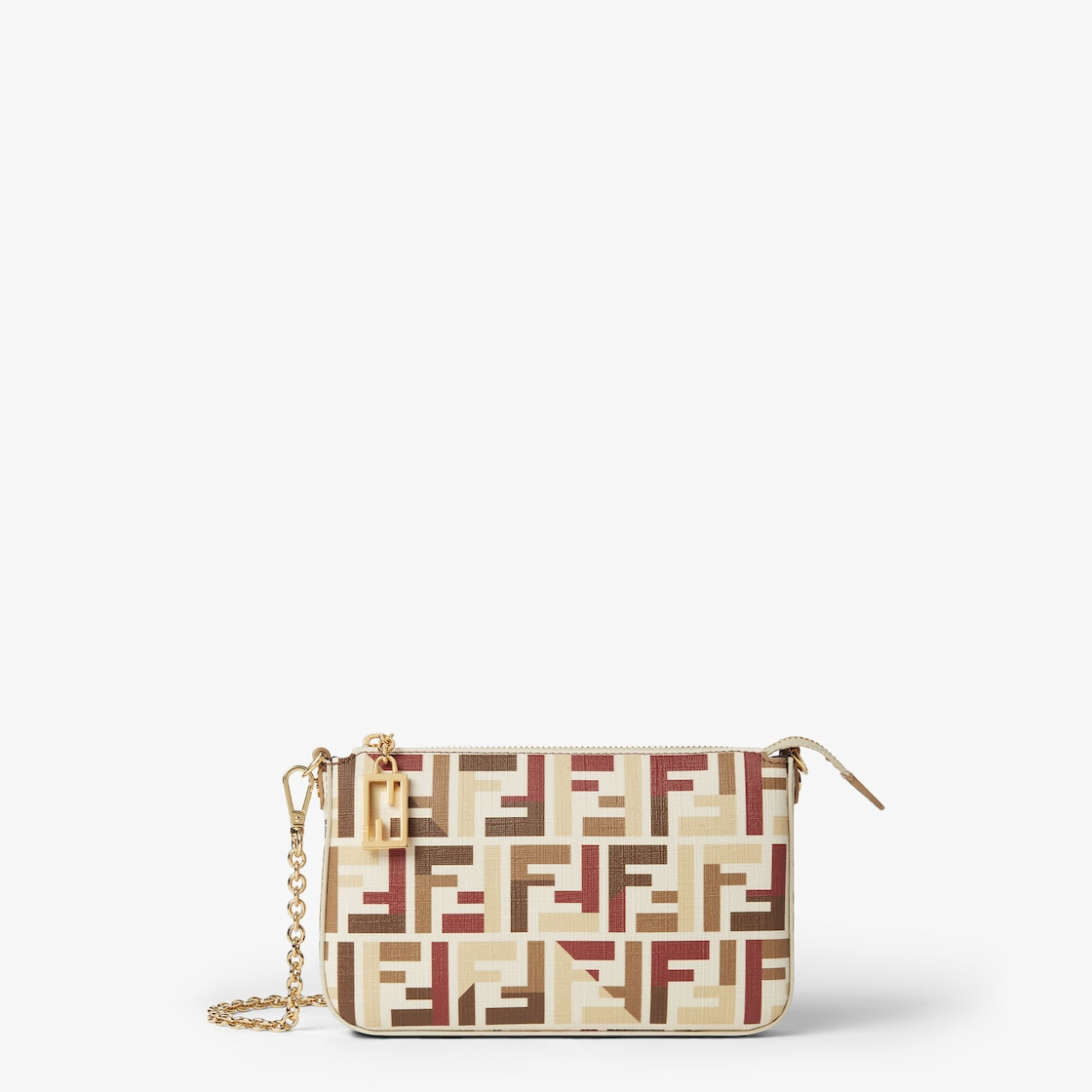 Baguette pouch made of fabric with iconic multicolored FF motif jacquard. Closed by zipper and zipper-pull with iconic FF motif. Lined interior, pocket with card holder slots and gold-finish metalware. It can be carried by hand, under the arm or cross-body thanks to the short, slim chain shoulder strap and long leather shoulder strap, both detachable. Holds a 6.7-inch smartphone and keys. The card holder is integrated inside the bag. Made in Italy Composition: 54% polyurethane, 22% polyamide, 12% cotton, 12% polyester, inside: 63% cotton, 34% polyester, 3% acrylic Product Code: 8BS073AV1YF1TVK