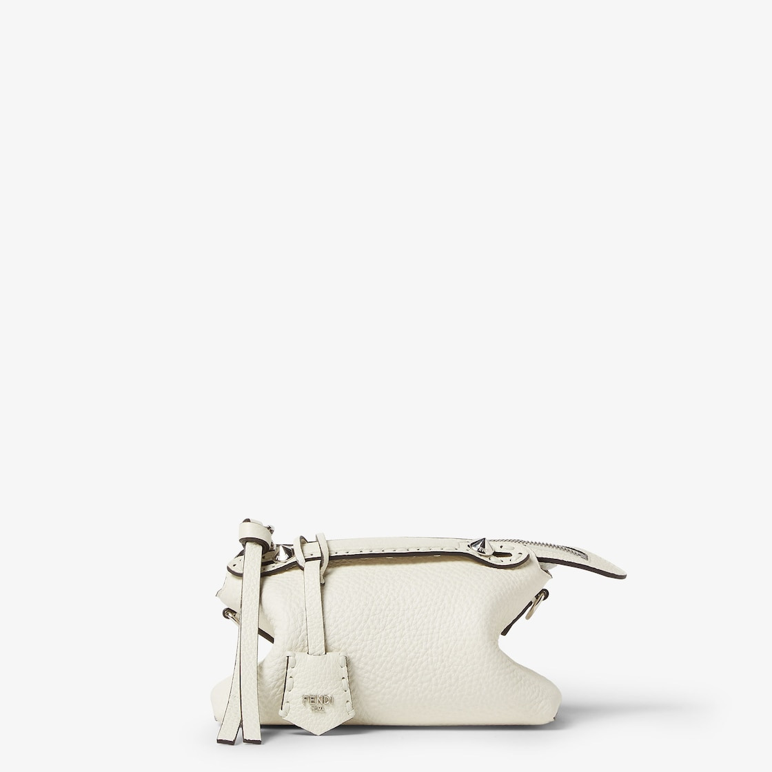 Iconic mini By The Way Selleria bag, reworked for the Fall-Winter 2024/25 fashion show for a relaxed, lightweight look. Made with 156 hand-sewn tone-on-tone macro topstitches, an emblem of the iconic Selleria workmanship handed down through generations of Fendi artisans since 1925. Made of white Cuoio Romano leather, calfskin with a characteristic natural grain, produced with a metal-free tanning process. Featuring a leather-lined interior, hand-stitched Selleria stamp in Cuoio Romano leather and palladium-finish metalware. Customizable pendant and long zipper-pull with knot. The bag can be carried by hand with the handles, or worn either on the shoulder or cross-body with the adjustable, detachable shoulder strap that can be knotted. Holds a 6.7-inch smartphone, Mini Trifold card holder or wallet, keys and lipstick. Made in Italy Composition: 100% calf leather, inside: 100% calf leather Product Code: 8BS098ASU2F1JBP