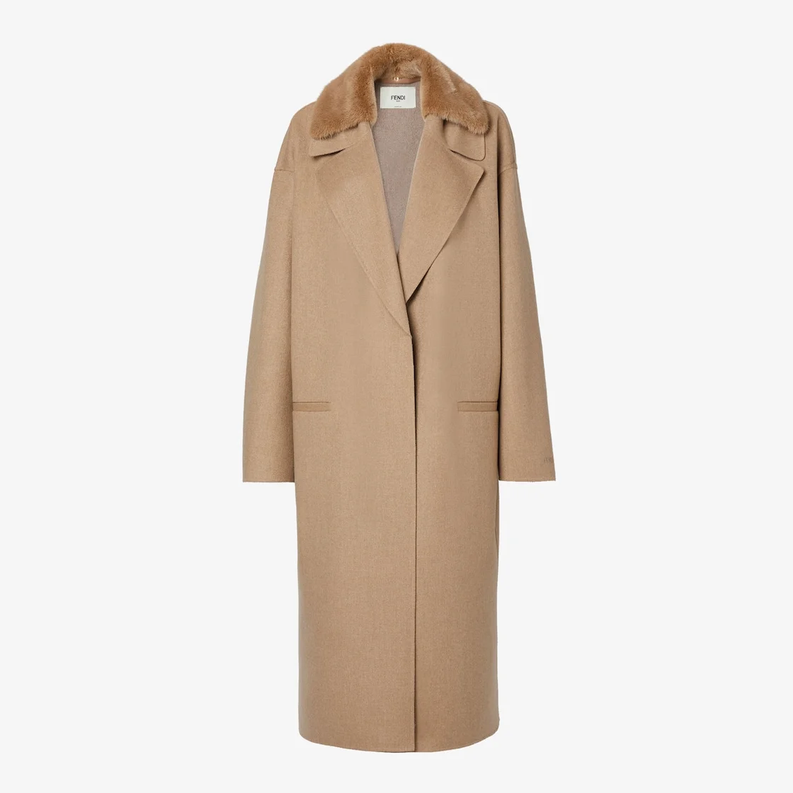 Oversize coat with a large collar and fur lapels. Low-set sleeves and horizontal welt pockets on the sides. Fastens with matching belt. Made of lightweight double-face cashmere in beige. Embellished with a matching embroidered logo on the left-hand cuff. Paired with a matching double belt in cashmere: one with a tone-on-tone covered buckle, the other with a palladium-finish metal FF buckle. Made in Italy Composition: 96% cashmere, 4% elastane, lining: 100% silk, 6 buttons: mother of pearl, neck: 100% mink fur Product Code: FF6172ANQ1F1KXQ