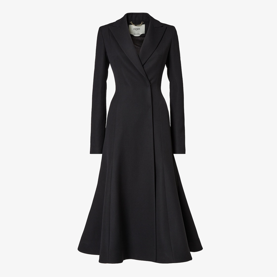 Midi coat with peplum detail at the hem, fitted at the waist and slightly flared at the hem. Internal closure with hooks. Made of black wool grain de poudre. Lining customized with FF jacquard. Made in Italy Composition: 100% fleece wool, lining: 100% viscose Size worn: 38 IT. The model is 178 cm tall Product Code: FF6158AJYFF0GME