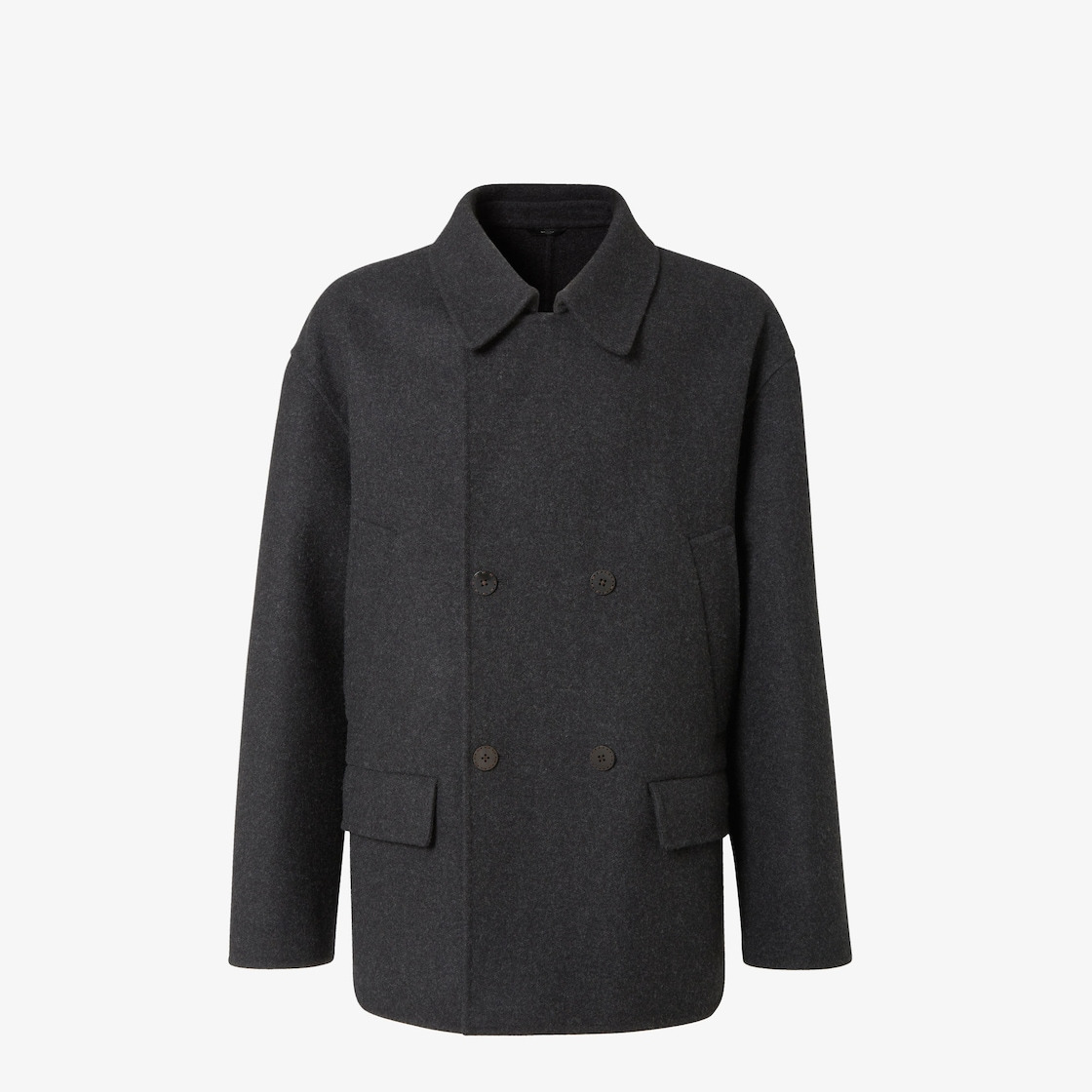 Double-breasted pea coat with shirt collar and long sleeves with dropped shoulders. Slanted, hand-warmer welt pockets and low front patch pockets. Unlined. Made of a black, double melange wool felt. Made in Italy Composition: 100% fleece wool, lining: 100% cupro Size worn: 48 IT. The model is 187 cm tall Product Code: FW1415AOYAF0TY6