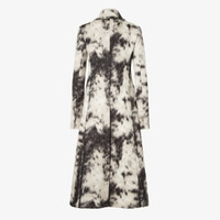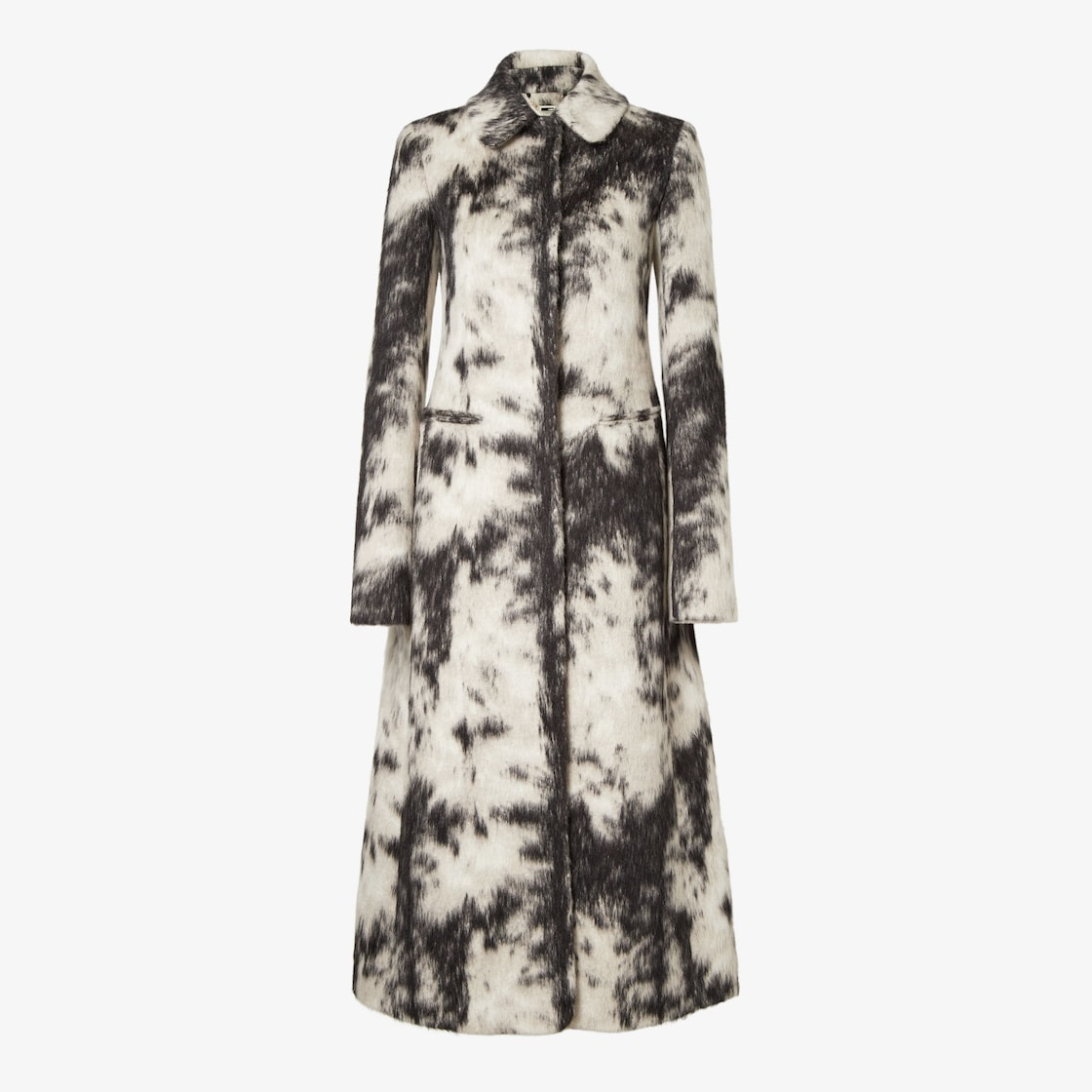 Long, slightly flared coat. Shirt collar, long sleeves and horizontal welt pockets. Concealed front closure. Made of long-haired wool with an exclusive Frosted Fauna motif printed all over: a nuanced reinterpretation of the timeless black and white animalier print, inspired by an archive coat by Silvia Venturini Fendi. Made in Italy Composition: 61% fleece wool, 39% lama, lining: 100% viscose Size worn: 38 IT. The model is 178 cm tall Product Code: FF61594IYF09TJ