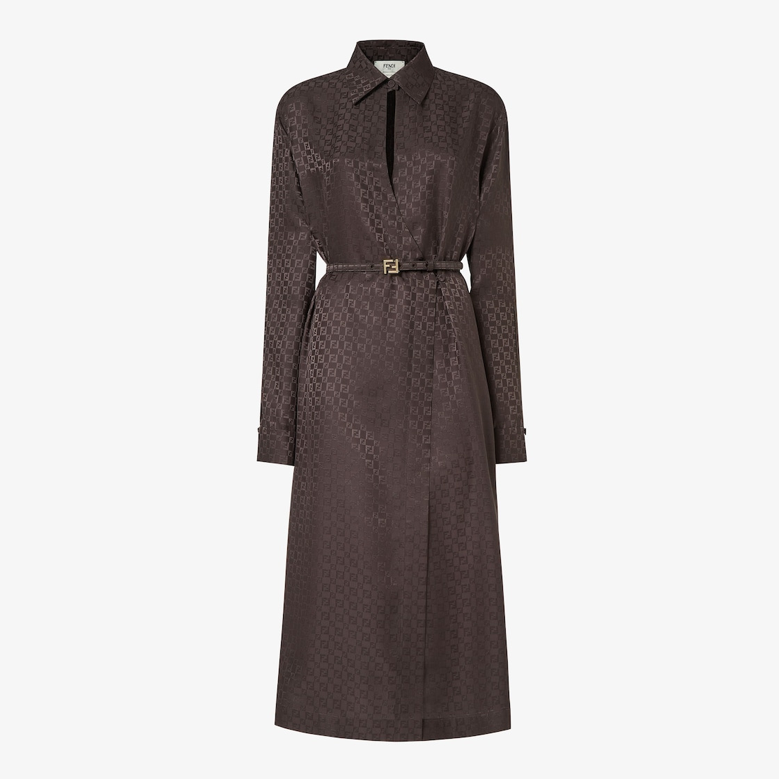 Midi shirt dress with shirt collar and cuffs. Flowing style with dropped shoulder and teardrop detail on the neckline. Asymmetrical cross fastening with small button on the side. Made of jacquard silk with an iconic dark brown checkered FF motif. Matching belt with FF buckle. Made in Italy Composition: 100% silk Size worn: 38 IT. The model is 180 cm tall Product Code: FDD443AUQGF1T6H