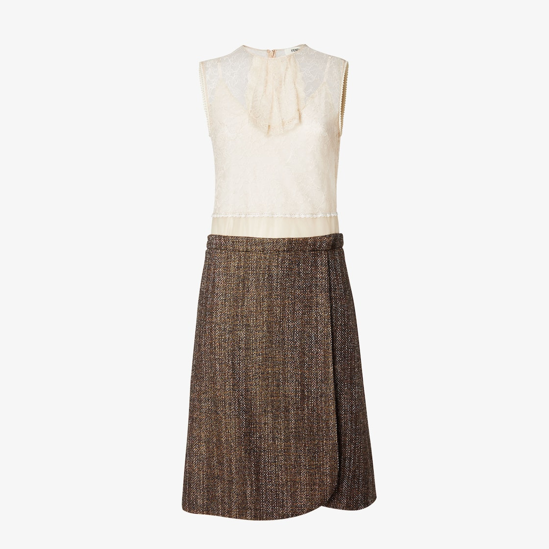 Trompe-l’oeil effect midi dress with round neckline and wrap skirt. Side pockets and back closure. Lined in silk. Made of a brown wool tweed skirt and a cream lace top. Finished with trimming details and tone-on-tone lace jabot motif on the front. Made in Italy Composition: 43% wool, 40% alpaca, 17% polyamide, 51% viscose, 49% polyamide, 100% polyamide, lining: 100% silk Size worn: 38 IT. The model is 180 cm tall Product Code: FDD425AVJAF1M2A