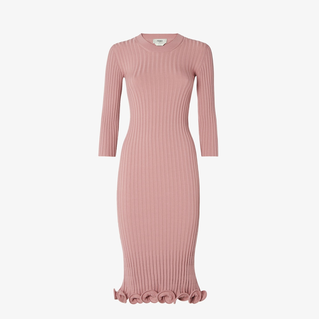Close-fitting midi dress with round neck and long sleeves. Made of a plated rib knit in wool and Japanese Lycra. Finished with matching-tone ruffle detail on the hem, inspired by an archive look from the Fendi Fall/Winter 1993 fashion show. Made in Italy Composition: 100% wool Product Code: FZDD96AUZXF1T6N