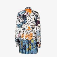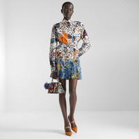 Short shirt dress with shirt collar and long sleeves. Breast pocket. Waistline seam and pleated skirt. Visible front button closure. Made of silk taffeta with the Falena print in two tones, white and light blue, creating a double layer effect. Made in Italy Composition: 100% silk, 12 buttons: mother of pearl Product Code: FDD512AVJWF0HWA