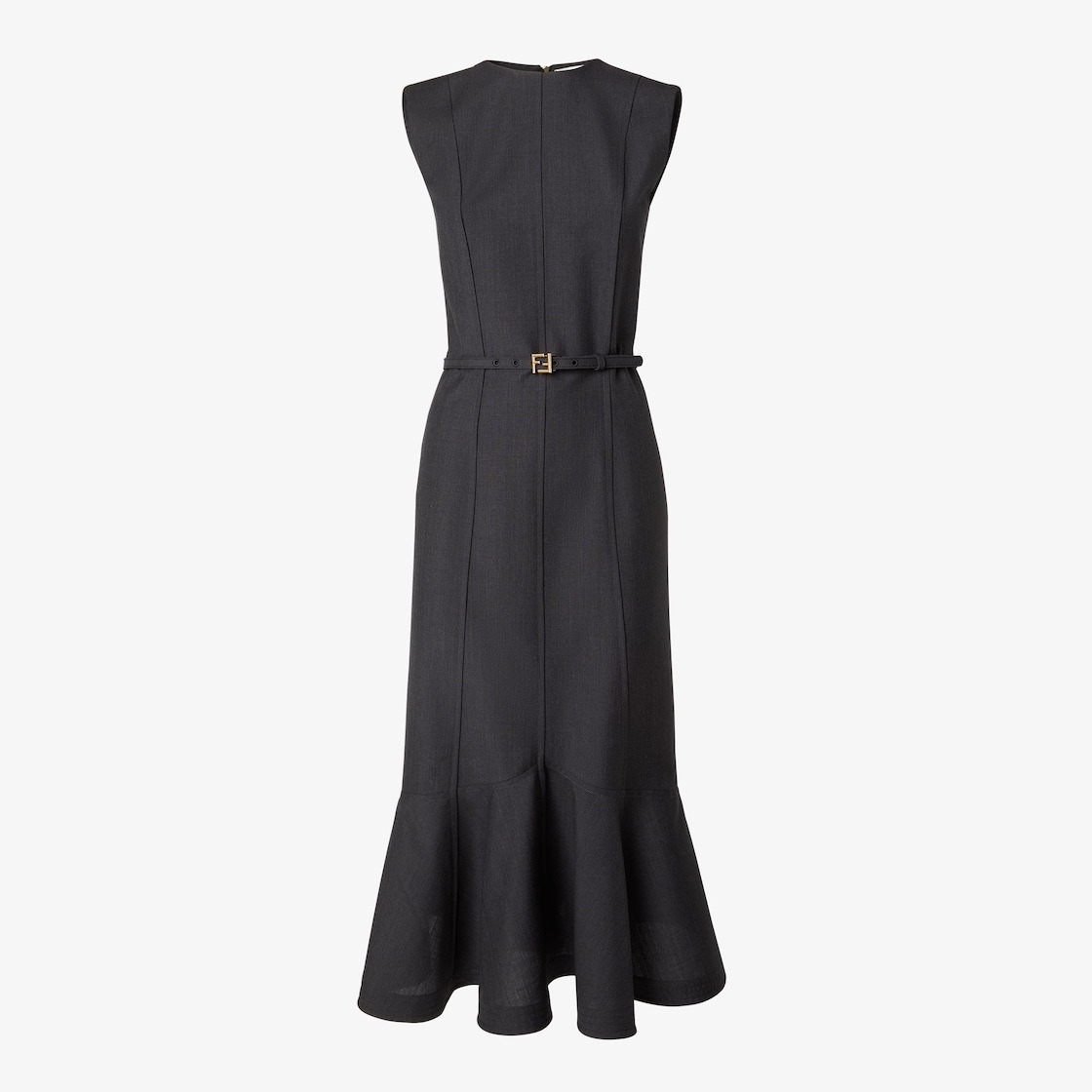 Sleeveless midi dress with peplum detail at the hem. Crew neck and zipper fastening on the back. Lined in silk. Made of wool and mohair in dark gray melange. Made in Italy Composition: 75% wool, 25% mohair, 75% wool, 25% mohair, fabric inner lining: 100% silk Size worn: 38 IT. The model is 180 cm tall Product Code: FDD428AQ3HF0DS6
