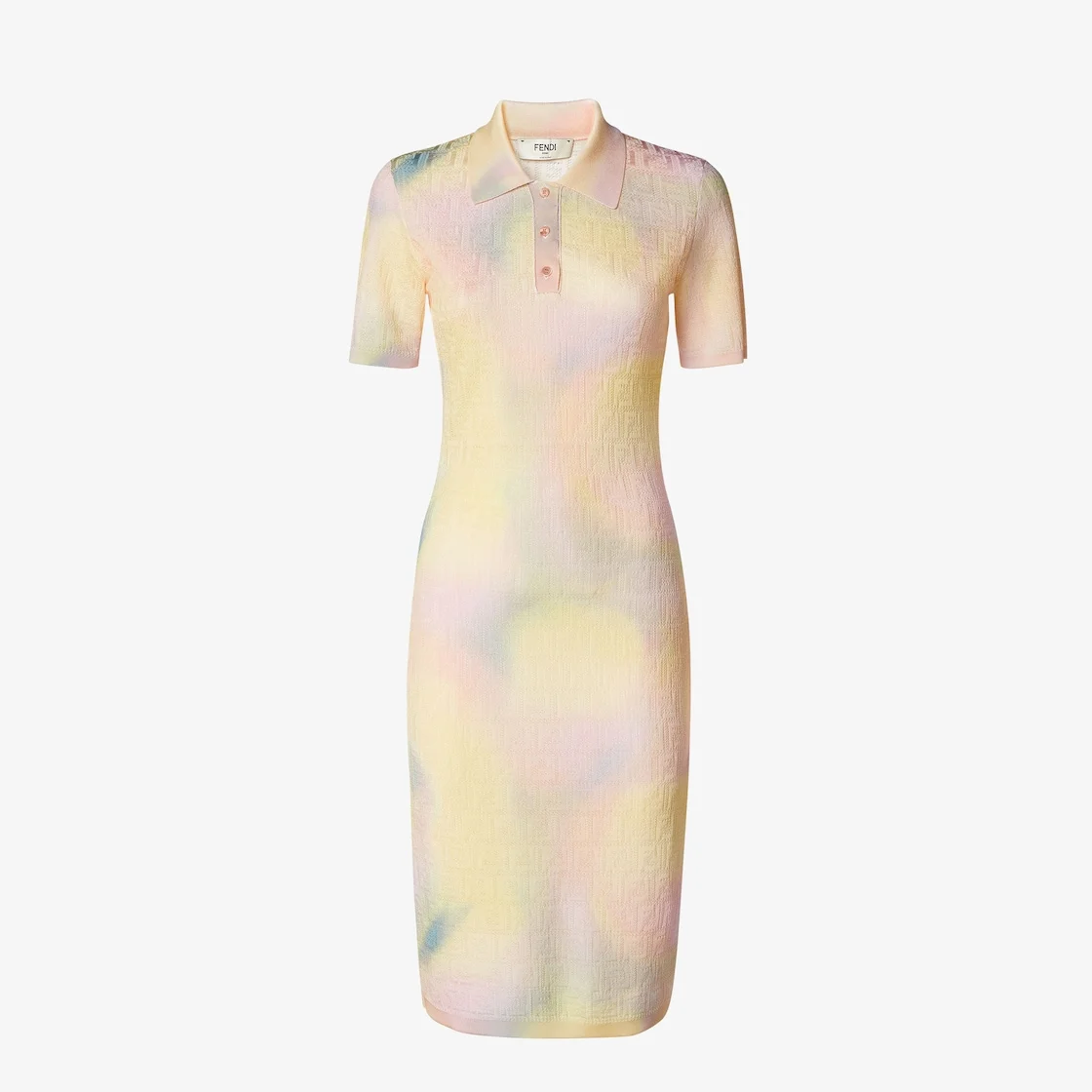 Midi dress with polo collar and short sleeves. Fitted. Part of the “Fantastic Fendi Future” capsule collection designed in collaboration with Japanese artist AYA TAKANO and made using the Fantastic Rainbow viscose yarn in various pastel tones with the iconic FF motif crocheted all over. Artwork ©2025 AYA TAKANO/Kaikai Kiki Co., Ltd. All Rights Reserved. Made in Italy Composition: 100% viscose, lining: 100% cotton, 12 buttons: mother-of-pearl Product Code: FZDE13AW4JF0ZA0