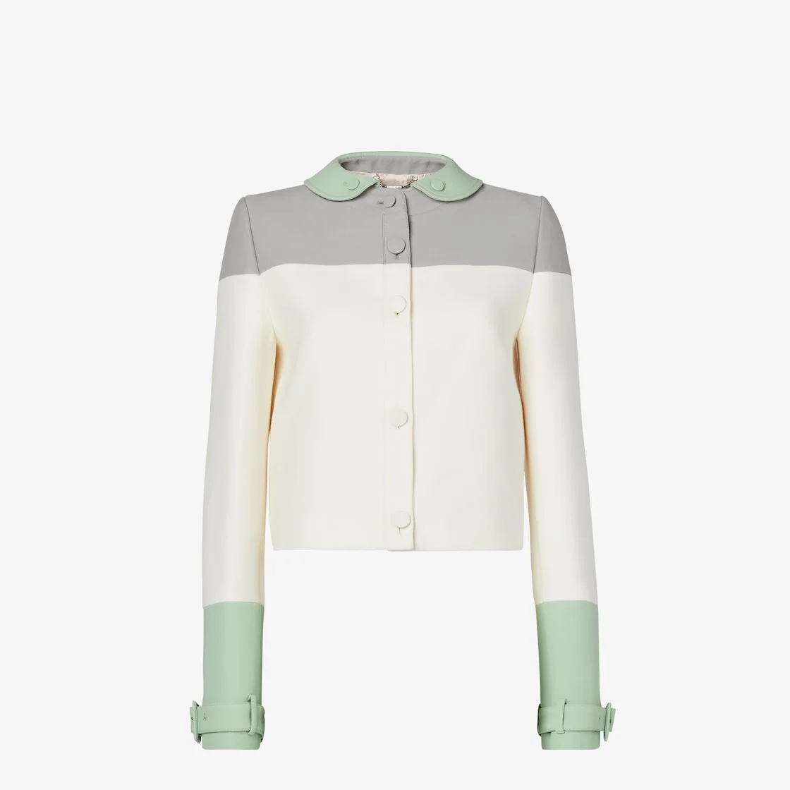 Short single-breasted jacket with rounded Peter Pan collar and long sleeves with cuff straps. Patch pockets on the front. Covered button closure in matching tone. Part of the Fendi “Fantastic Fendi Future” capsule collection, designed in collaboration with Japanese artist AYA TAKANO, it is made of wool and silk in white, gray and light green color blocks. Artwork ©2025 AYA TAKANO/Kaikai Kiki Co., Ltd. All Rights Reserved. Made in Italy Composition: 77% wool, 23% silk, lining: 100% cupro Product Code: FJ7687AC4GF0ZA0