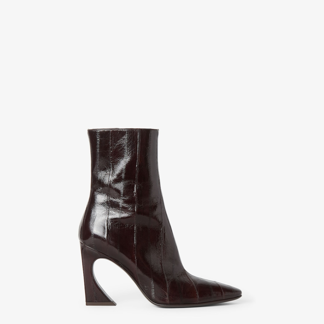 Ankle boots with internal zipper. Made of shiny brown hagfish leather. High heel covered in matching hagfish leather with iconic Arco line. Gold-finish metal detail on the heel, customized with engraved logo. Leather soles. Gold-finish metalware. Made in Italy Composition: 100% hagfish, inside: 100% calf leather Product Code: 8T8776AOSHF0BBK