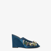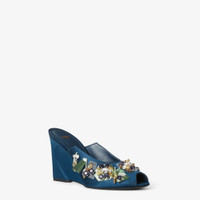 Wraparound peep-toe sandals with wedge heel featuring the iconic contoured Arco motif. Made of petrol blue satin, decorated with three-dimensional embroidery consisting of sequins, crystals and sculptural-effect mirror appliques in different contrasting colors. Gold-finish metal detail on the heel, decorated with engraved Fendi logo. Made in Italy Composition: 72% viscose, 28% silk, inside: 100% lamb leather Product Code: 8R8810AY9MF1A52