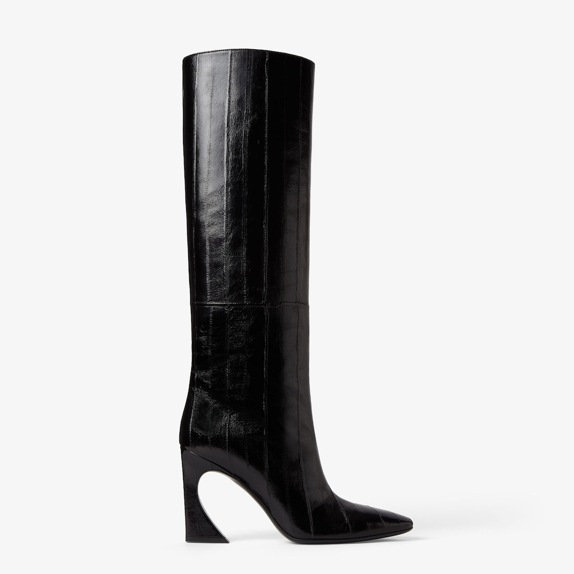 Tubular boots with tapered toe and high heel featuring the iconic Arco line, customized with metal detail and engraved logo. Made of black shiny hagfish leather. Covered heel and leather sole. Made in Italy Composition: 100% hagfish, inside: 100% calf leather Product Code: 8W8802AOSHF0QA1