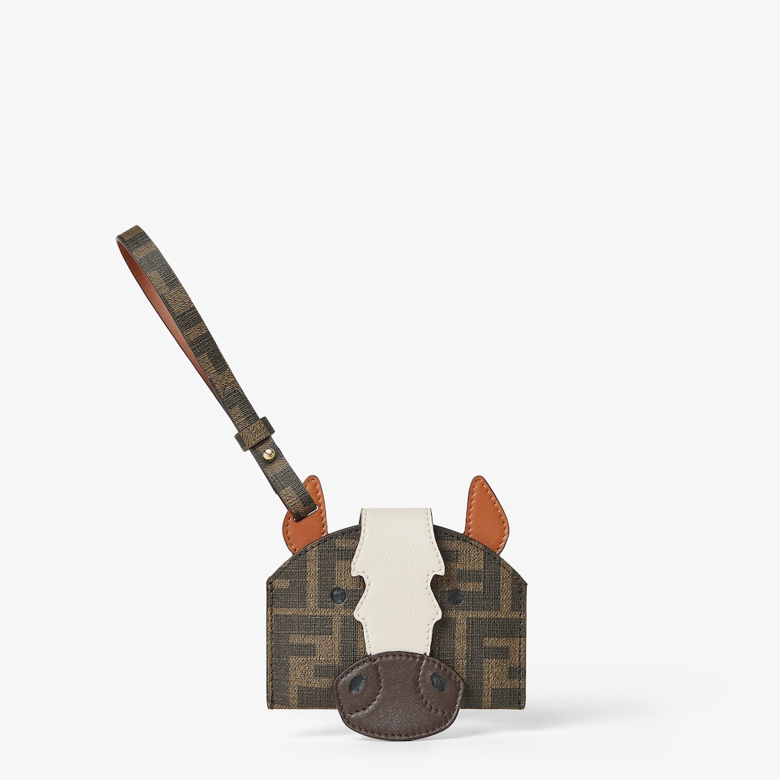 Fendi Best Friends Forever card holder with horse-head design. Features an internal compartment and clasp with bridge and hidden snap button. Leather strap to attach it to bags and belts. Made of fabric with iconic FF motif and white and brown details. Gold-finish metalware. Made in Italy Composition: 100% calf leather, 49% polyurethane, 28% cotton, 23% polyester, back: 100% calf leather Product Code: 8M0524AYIYF1TWY