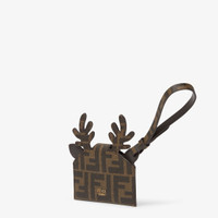 Fendi Best Friends Forever card case with a reindeer-head design. Features an internal compartment and clasp with bridge and hidden snap button. Leather strap to attach it to bags and belts. Made of tobacco brown FF fabric with details in multicolored leather. Gold-finish metalware. Made in Italy Composition: 49% polyurethane, 28% cotton, 23% polyester, 100% calfskin, inside: 100% calfskin Product Code: 8M0542AWDAF1TWY