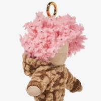 Bread bag charm made of suede with pink shearling hair. Wool sweater with iconic FF motif in brown. Leather Bermuda shorts and white leather trainers with FF detail. Leather loop with clip and hot-stamped Fendi Roma logo on the back. Gold-finish metalware. Perfect for customizing the look of the collection bags. Made in Italy This product is not a toy and is intended exclusively for adults. Composition: 100% zamak, 100% sheep fur, 100% goat leather, 100% wool, 100% lamb leather, 100% cotton, padding: 100% polyester Product Code: 7AS435AYIIF0MWU
