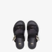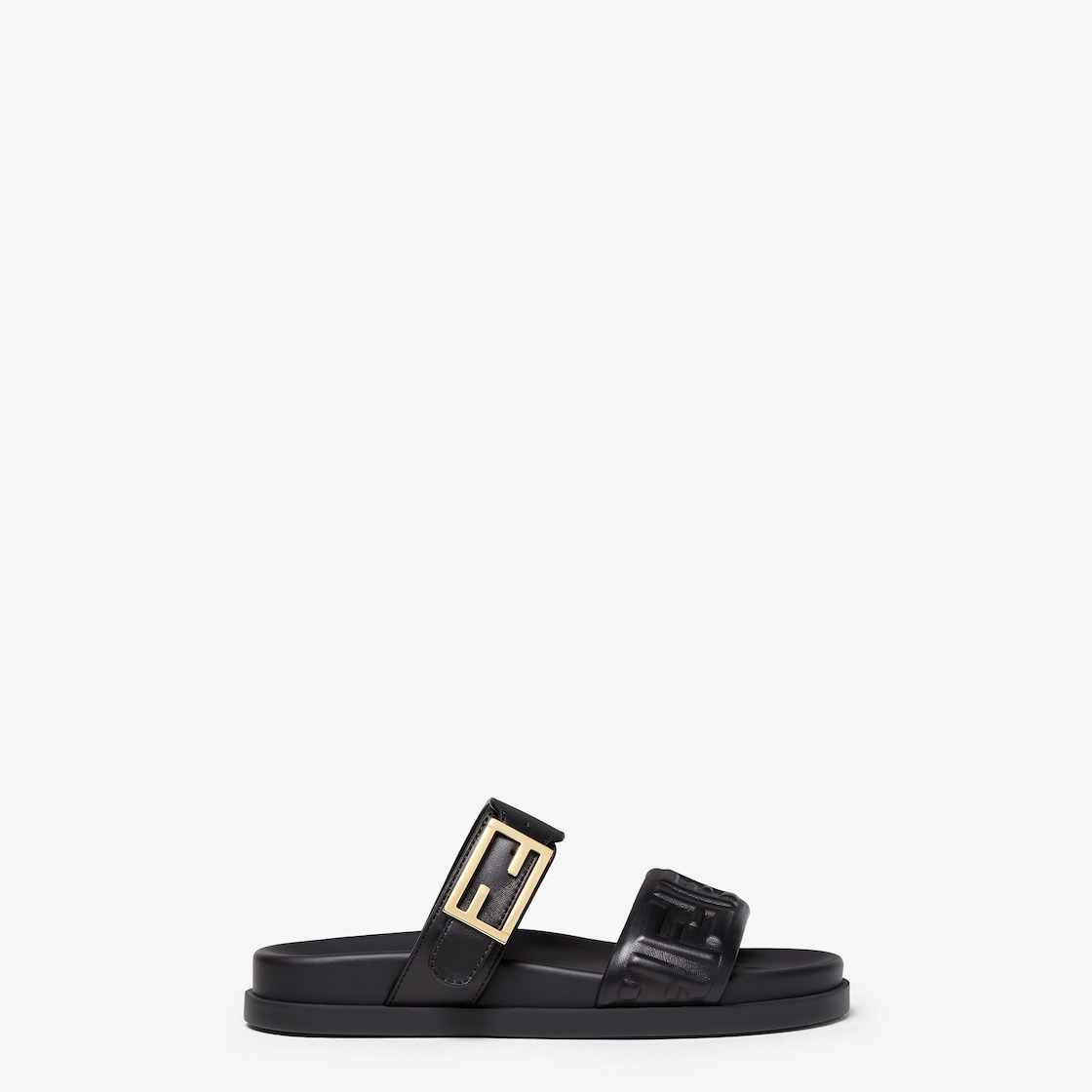 Double-band flat slides with FF Baguette decorative buckle. Made of black nappa leather with embossed FF motif on the front of the band. Gold-finish metalware. Made in Italy Composition: 100% lamb leather, inside: 100% calf leather Product Code: 8X8710ABOHF0ABB