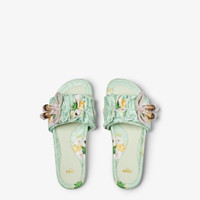 Wide-band flat slides. Made of FF jacquard satin with Fendi Bouquet print in light green and pink. Decorated with a gathered bow with pink braided ribbon drawstring. Brown resin-effect beads and square gold-colored metal element with FF motif. Made in Italy Composition: 96% polyester, 4% elastane Product Code: 8X8142AWL6F1VP0