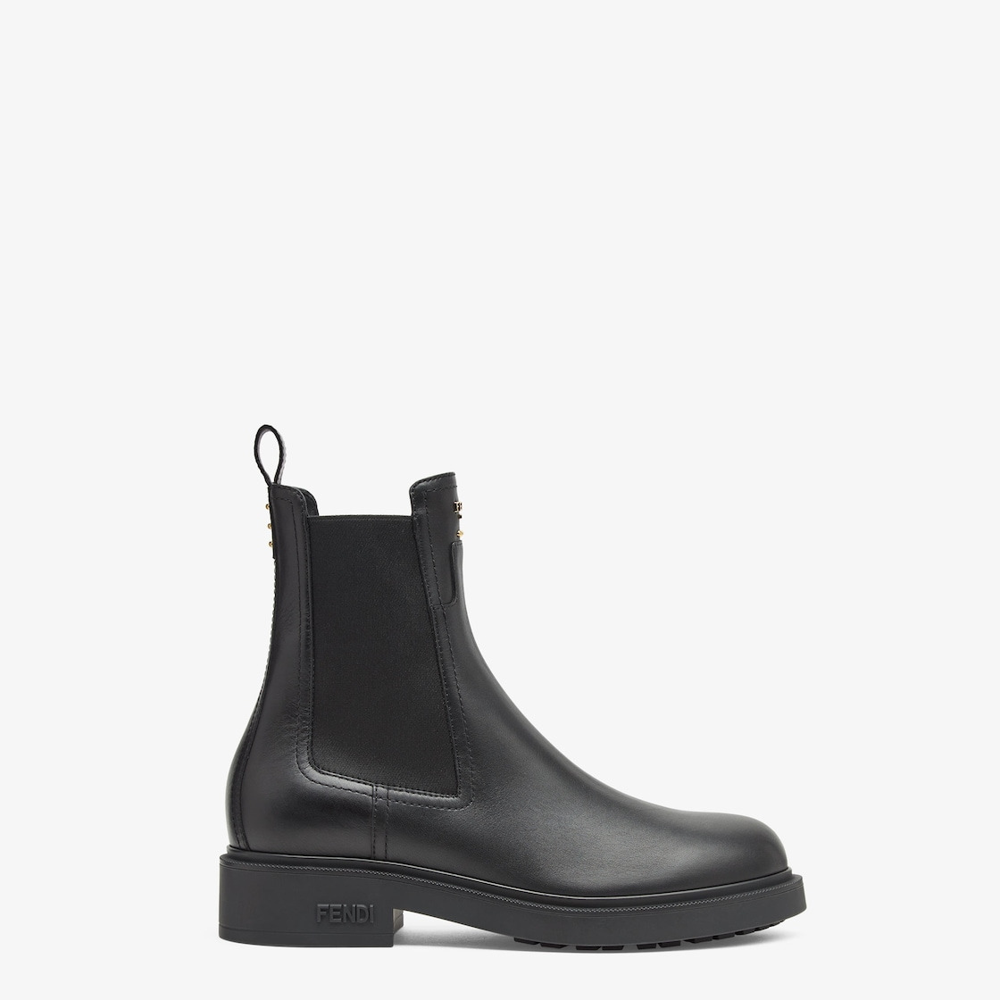 Fendi Filo biker boots with round toes and elastic inserts at the sides. Made of black leather. Embellished with metal Selleria stitching on the back and embossed metal Fendi Roma lettering on the front. Rubber sole and heel with Fendi lettering on the side. Made in Italy Composition: 100% calf leather, interior: 100% calf leather Product Code: 8T85769W4F0ABB