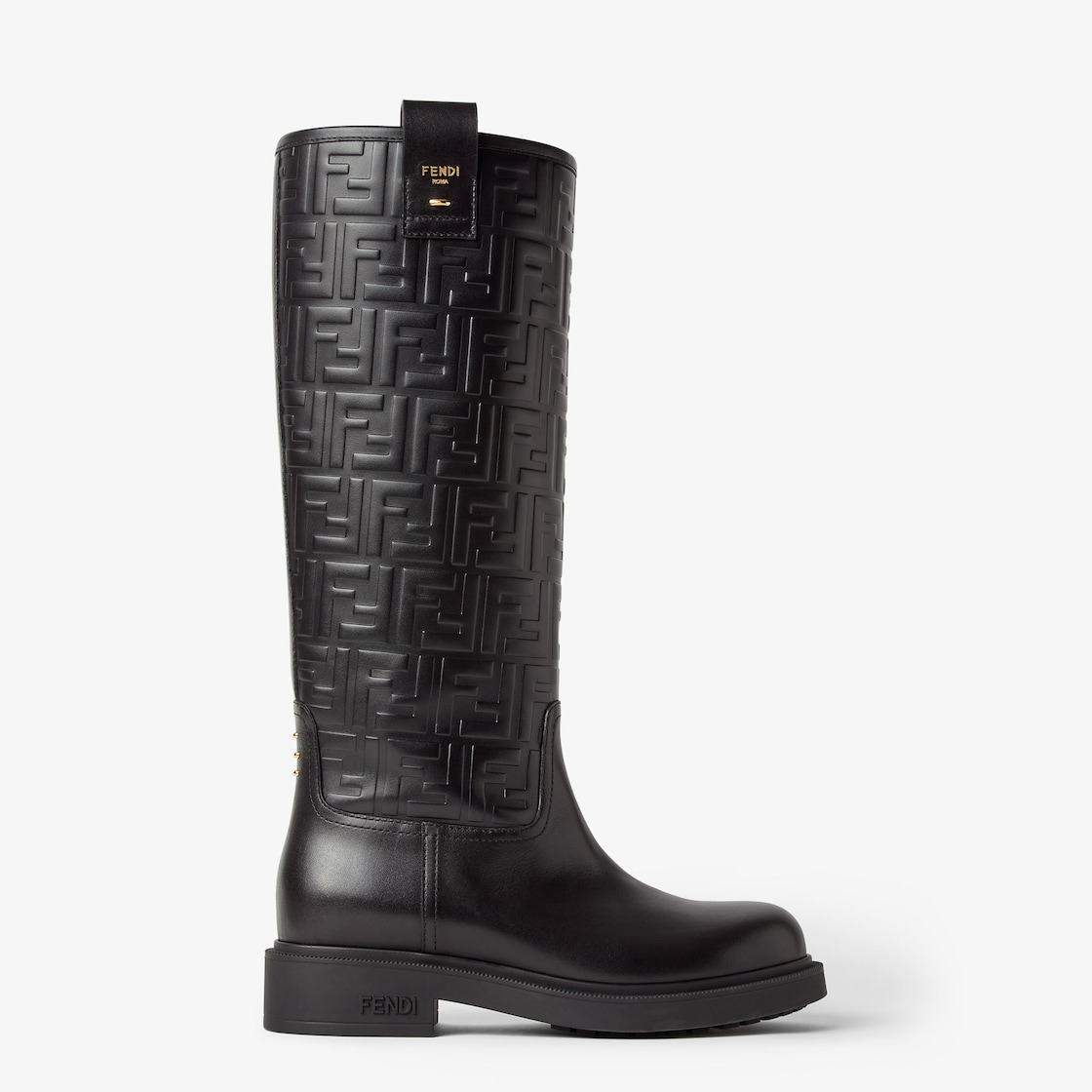 Tubular leg boots with round toe. Made of black leather. Leg with iconic FF motif in heat-stamped relief. Decorated with Selleria metal stitching and Fendi Roma metal lettering. Rubber sole and heel with Fendi lettering on the side. Gold-finish metalware. Made in Italy Composition: 100% calf leather, inside: 100% calf leather Product Code: 8W8574AY9OF0ABB
