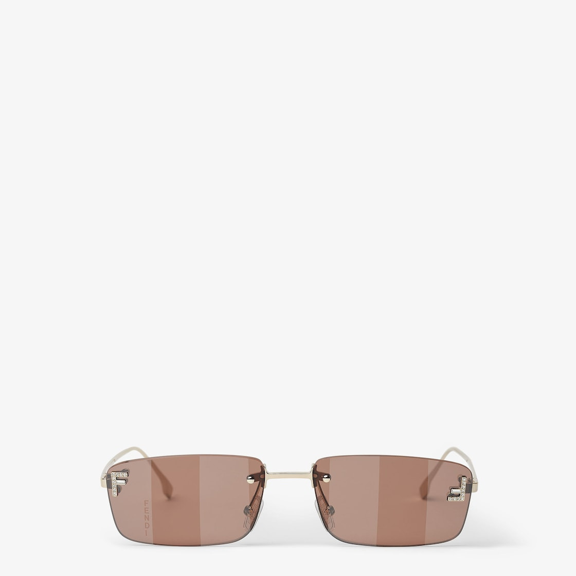 Rectangular Fendi First Crystal eyeglasses with a rimless structure in gold-colored metal. Rust-color lenses with Pequin motif and micro F in crystals. Adjustable nose pads. Made in Italy Composition: 100% metal Product Code: FOL117V1TF1RVP Product Care: Wash your eyeglasses every day with warm water and a pH-neutral soap.Do not use alcohol, aggressive chemical products or disinfectant wipes and do not dry them with paper or other cloths that could scratch them or leave streaks.Dry with a clean microfiber cloth.After use, always keep your eyeglasses in their case.