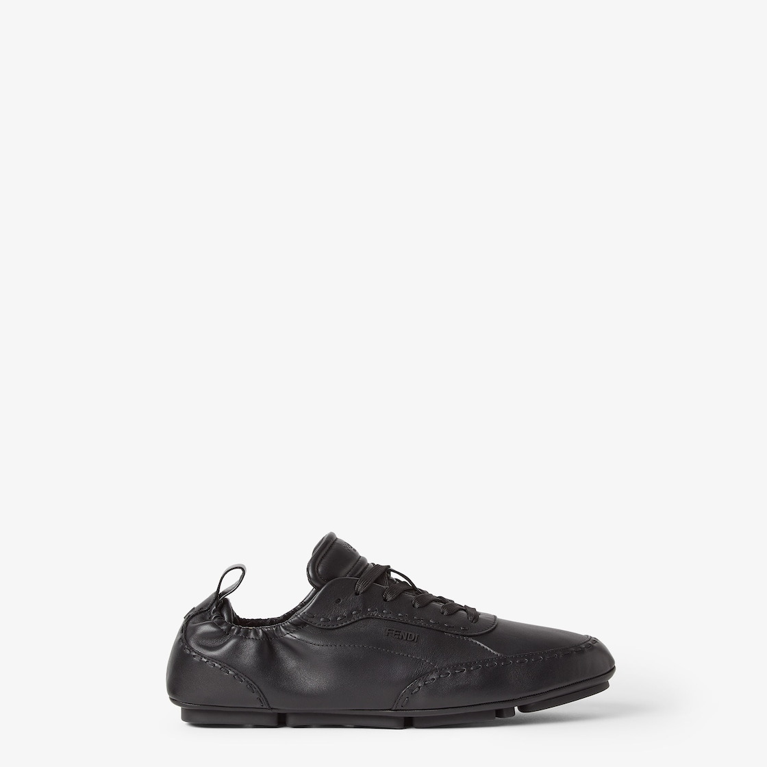 Fendi Fit lace-up low-tops. Made of high-quality smooth black leather and finished with hand-sewn, tone-on-tone macro topstitches, an emblem of the iconic Selleria workmanship handed down through generations of Fendi artisans since 1925. The flexible pouch construction with elastic insert and heel padding guarantees a comfortable fit. Finished with 3D Fendi logo on the side. Rubber injection sole featuring Fendi motif. Made in Italy Composition: 100% calf leather, inside: 100% calf leather Product Code: 7E1799AE86F0ABB