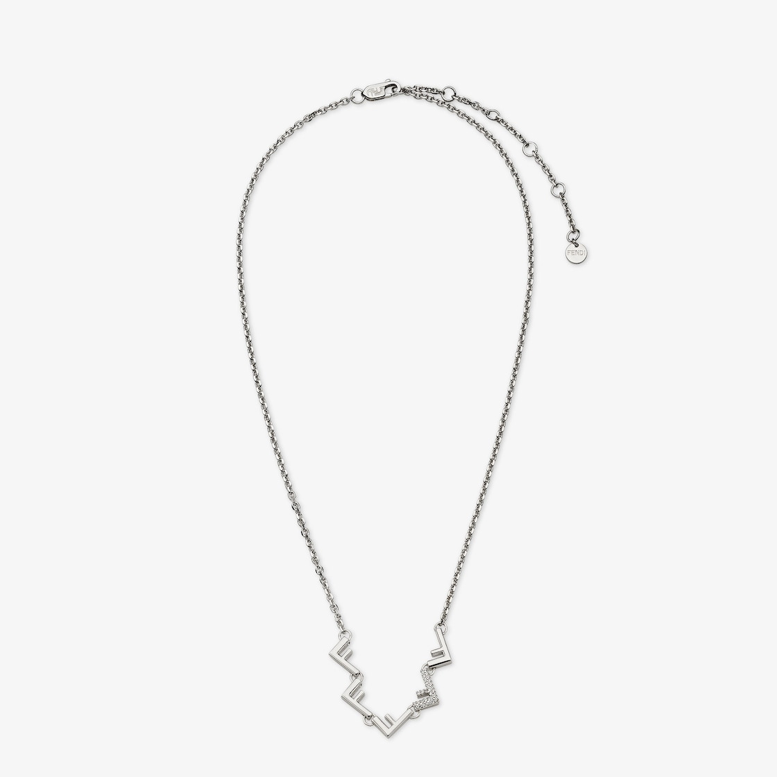 Slim chain with a small clip and all-over F motif detail. Made of palladium-finish metal and decorated with five Fs inspired by the five Fendi sisters. Embellished by an F decorated with white crystals. Made in Italy Composition: 100% brass, 100% crystal Product Code: 7AJ734A44GF035M Product Care: The product you have purchased may be embellished with a precious metal top or varnish and may also feature appliques, gemstones (in various shades of the same color), crystals, plexiglass or resin. The mixture of materials and the special details give this product its unique character. To best maintain the product’s appearance over time, avoid contact with sea water, spa water, lacquers, perfumes, solvents, chemicals and abrasive materials. If necessary, clean with water and a neutral soap and/or polish with a dry microfiber cloth.