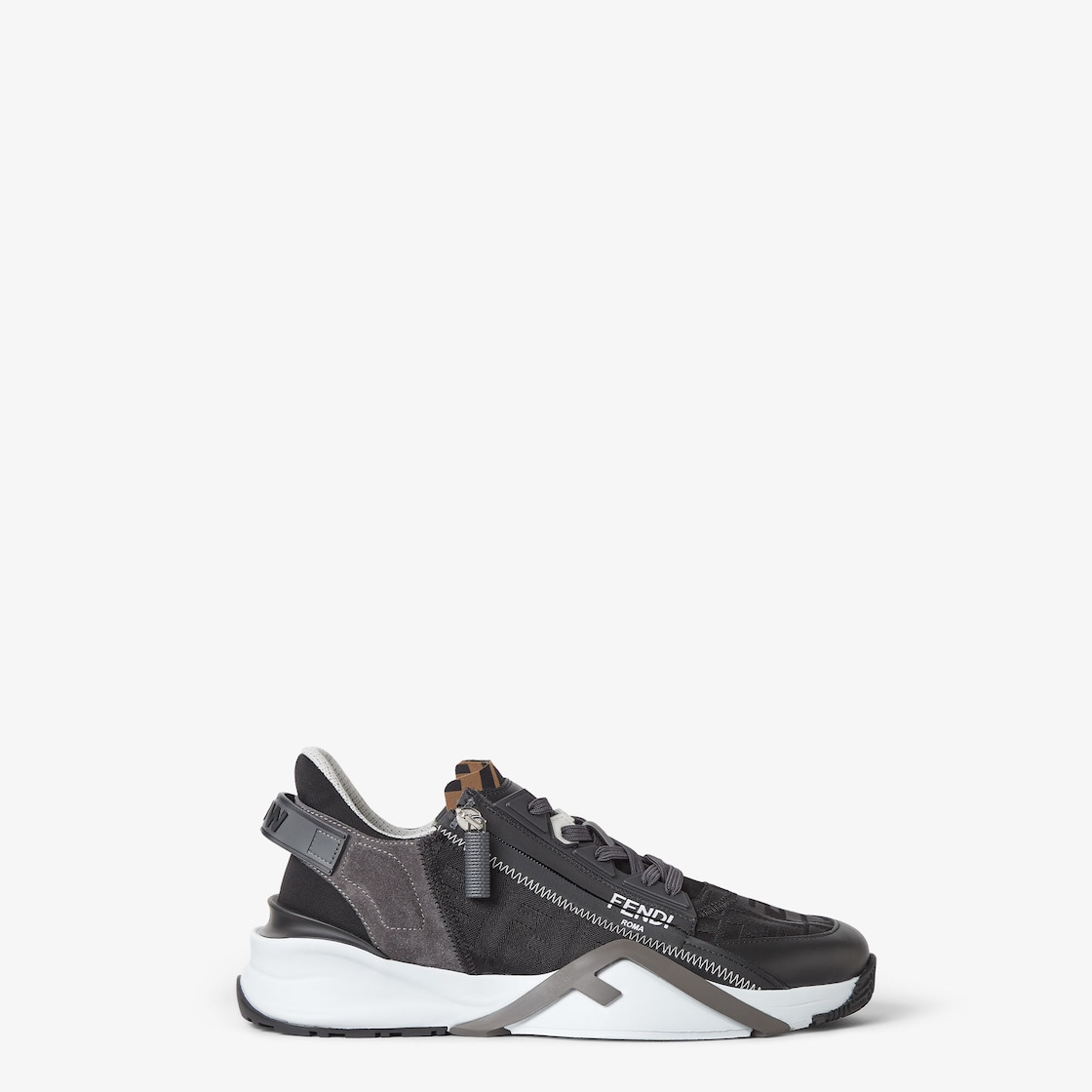 Slip-on sneakers with elastic laces, side zipper and corrugated sole with engraved F. Fendi Flow lettering embossed on the heels. Made of black FF Jacquard recycled nylon. Black leather and gray suede details. Embellished with Lycra® details with FF motif. White rubber soles with gray diagonal F detail. Made in Italy Composition: 100% calf leather, 100% polyamide, inside: 100% calf leather Product Code: 7E1392AY9WF1EX4