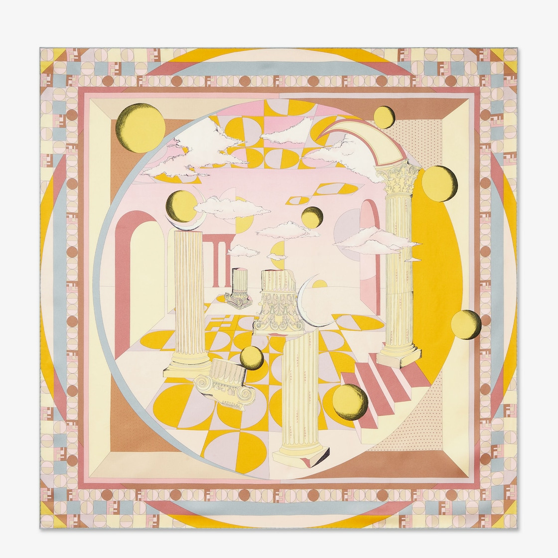Square silk foulard. Customized with the Moonlight Echoes print in pink and yellow, reinterpreting motifs inspired by Roman mosaics and Art Deco with columns, moons and suspended spheres: a tribute to Fendi’s heritage and the dialogue between history and modernity. The design is enhanced by a frame with a Fendi Optical motif in the same shades. Hand-rolled hems. Made in Italy Composition: 100% silk Product Code: FXT091AYL8F0B8Y