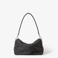 Medium Fendi Lui bag with a soft design, made of black padded FF nylon with a shiny and lightly embossed texture and black smooth calf leather. Decorated with a long zip fastening with double slider and FF metal appliques on the corners. Interior compartment with fabric lining, internal flat pocket and metalware with brushed ruthenium finish. The bag can be carried by hand, on the shoulder or cross-body thanks to the removable leather handle and adjustable, detachable webbing shoulder strap. Made in Italy Composition: 100% polyamide, 100% calf leather, inside: 63% cotton, 34% polyester, 3% acrylic Product Code: 7VA672AVC6F0SAJ