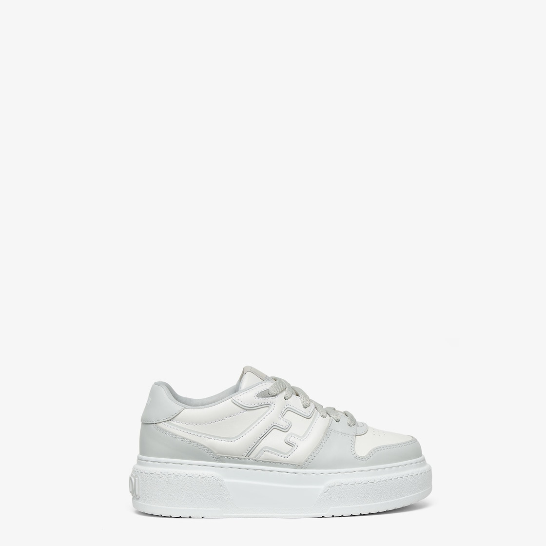 Fendi Match lace-up sneakers. Made of light gray leather with white leather inserts. Injection-molded FF appliqué on the sides and flat, maxi laces in white. 50 mm (2 inch) platform rubber sole with oversized, embossed Fendi lettering at the back. Made in Italy Composition: 100% calf leather, interior: 100% calf leather Product Code: 8E8571AOMNF1PYS