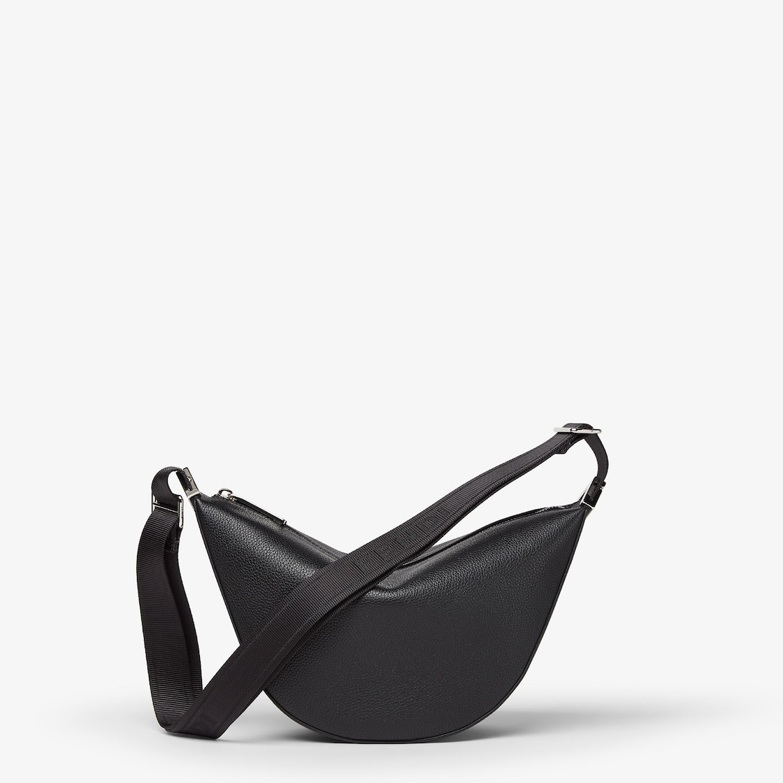 Small Fendi Melon crescent-shaped messenger bag. Made of black full-grain leather. Decorated with FF metal appliqués on the corners. Zipper closure and palladium-finish metalware. Technical fabric adjustable cross-body strap embellished with FENDI lettering. Made in Italy Composition: 100% calfskin, inside: 90% polyester, 10% polyurethane Product Code: 7VA635ASIHF0GXN