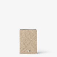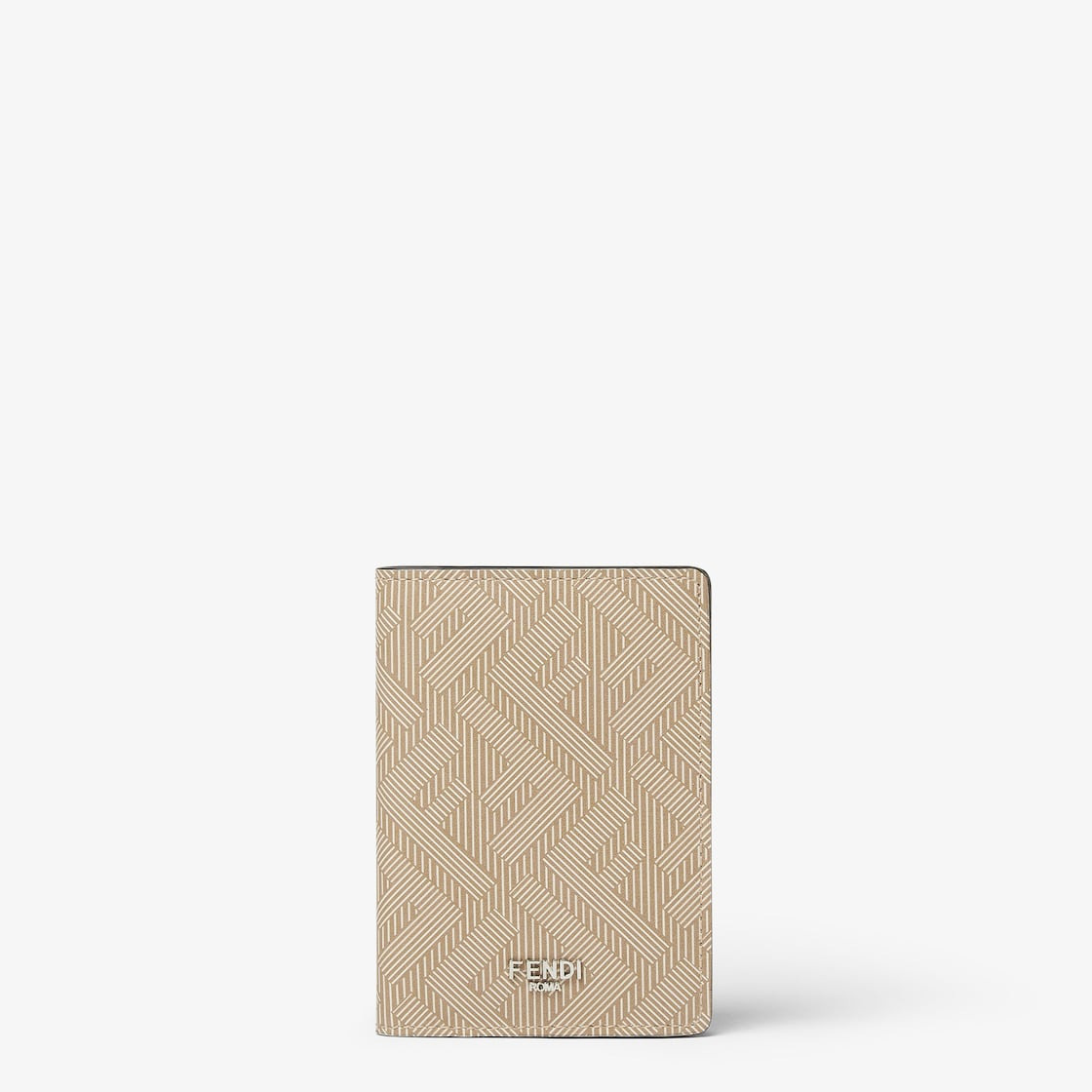 Compact bi-fold card holder with three inside card slots and one flat pocket inside and on the back. Made of beige Fendi Shadow leather with the FF motif printed in white. Beige and off-white leather lining. Metal Fendi logo with a palladium finish. Made in Italy Composition: 100% calf leather, inside: 62% cotton, 38% polyurethane Product Code: 7M0349AP16F1RHO