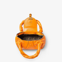 Mini Fendi Spy Bag, a contemporary reinterpretation of a famous Fendi It bag presented in the Spring Summer 2005 Fashion Show, distinguished by its unique and unmistakable design. An expression of fine craftsmanship, it features distinctive twisted handles that embellish the silhouette. Made of orange full-grain calfskin. Rounded flap with clasp and knotted tie in tone-on-tone leather. Gold-colored hot-stamped FENDI ROMA logo. Featuring a tobacco-brown FF jacquard fabric-lined internal compartment and gold-finish metalware. The bag can be carried by hand, or worn either on the shoulder or cross-body thanks to the adjustable, detachable shoulder strap. Holds a 6.7-inch smartphone, Mini Trifold card holder or wallet, keys and lipstick. Made in Italy Composition: 100% calfskin, inside: 73% polyester, 27% cotton Product Code: 8BS110AVU5F1UZD