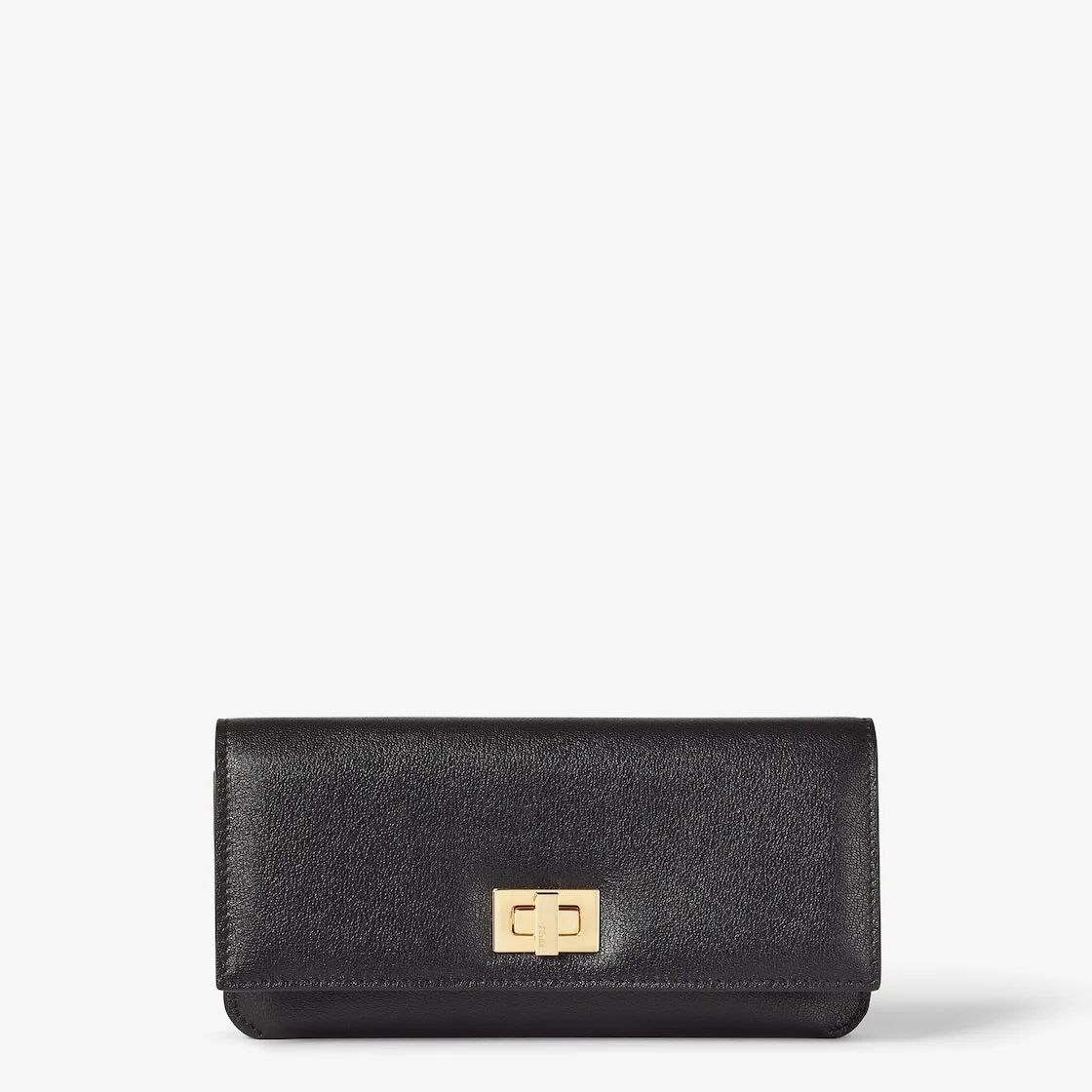 Fendi Way continental wallet with flap and twist lock. The interior features a wallet layout with two gusseted compartments, a zipper pocket and six card slots. Made of black leather with chocolate brown leather interior. Gold-finish metalware. Made in Italy Composition: 100% calfskin, inside: 100% calfskin, 96% viscose, 4% acrylic Product Code: 8M0554AWR7F1DDQ