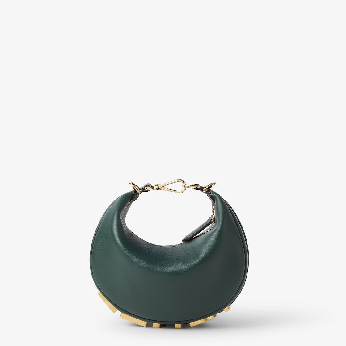 Mini Fendigraphy hobo bag with a contemporary look and bold details. Made of dark green calfskin, decorated with FENDI lettering in vintage gold metal on the base, visible when wearing the bag. Zipper closure with fabric-lined internal compartment, gold-finish metalware. It can be carried by hand by closing the bag with the clip, or worn on the shoulder or cross-body using the adjustable, detachable shoulder strap inserted inside the side attachment points. Holds a 6.2-inch smartphone, Mini Trifold card holder or wallet, keys and lipstick. Made in Italy Composition: 100% calf leather, inside: 63% cotton, 34% polyester, 3% acrylic Product Code: 8BS081A5DYF1TW6