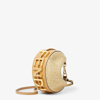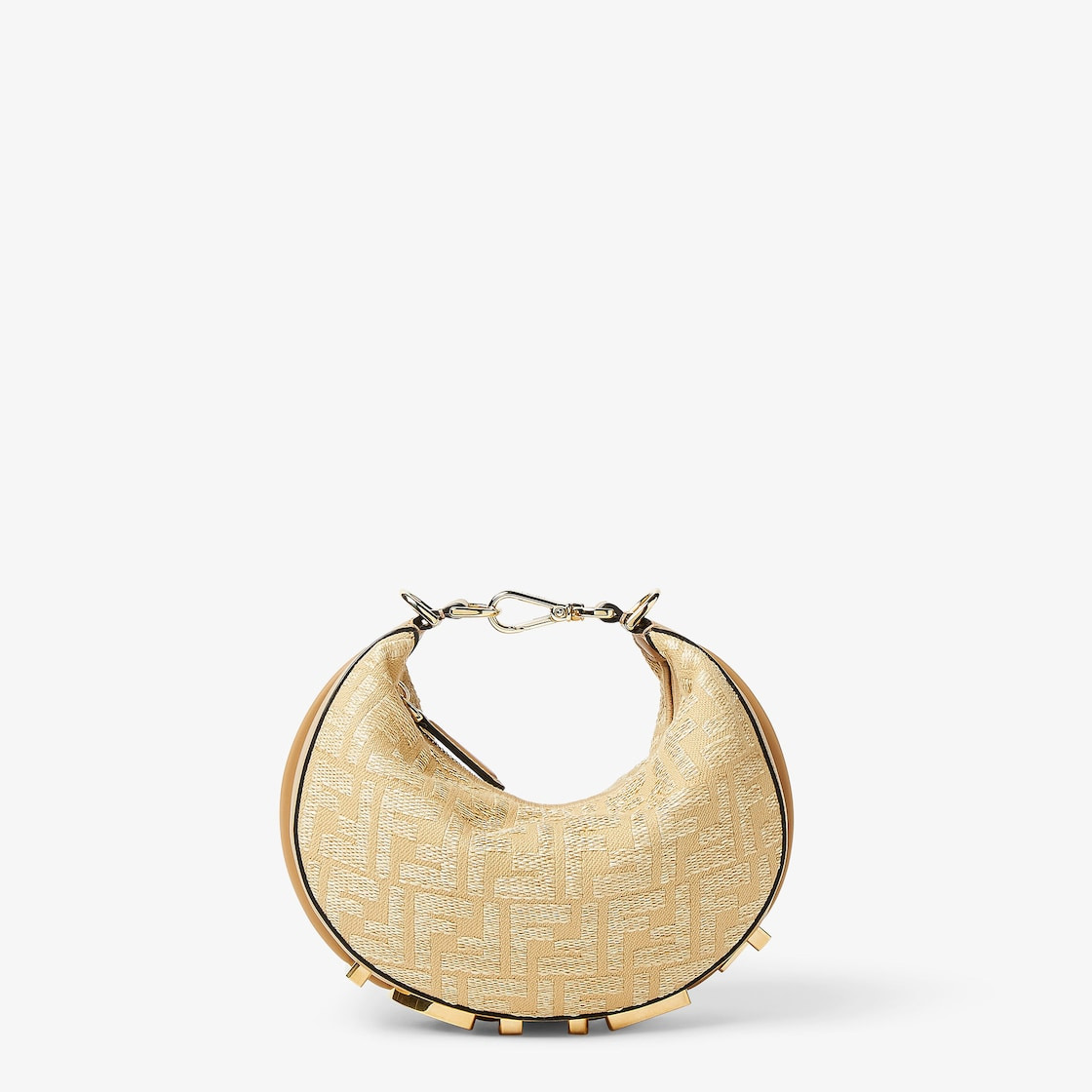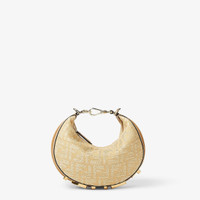 Mini Fendigraphy hobo bag with a contemporary look and bold details. Made of natural-color jacquard fabric with the iconic FF motif in viscose raffia. Trimmed with beige calfskin and decorated with vintage gold-finish metal FENDI lettering on the base, visible when the bag is worn. Zipper closure with a lined internal compartment, gold-finish metalware. It can be carried by hand by closing the bag with the clip or worn on the shoulder or cross-body using the adjustable, detachable beige leather shoulder strap inserted inside the side attachment points. Holds a 6.2-inch smartphone, Mini Trifold card holder or wallet, keys and lipstick. Made in Italy Composition: 75% polyester, 17% cotton, 8% elastane, 100% calf leather, inside: 63% cotton, 34% polyester, 3% acrylic Product Code: 8BS081AV23F1TCI