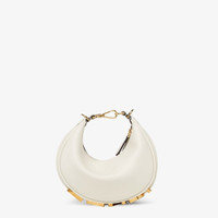 Mini hobo bag made of soft white leather, embellished with vintage gold metal FENDI lettering. Zipper closure with fabric-lined internal compartment, gold-finish metalware. It can be carried by hand thanks to the hook and clip to use as a handle, or worn cross-body using the thin, adjustable, detachable shoulder strap. Made in Italy Measurements: - Height : 13 cm - Depth : 7.5 cm - Width : 20 cm - Weight : 0.4 kg Composition: 100% calf leather, inside: 63% cotton, 34% polyester, 3% acrylic Product Code: 8BS081A5DYF1HEL