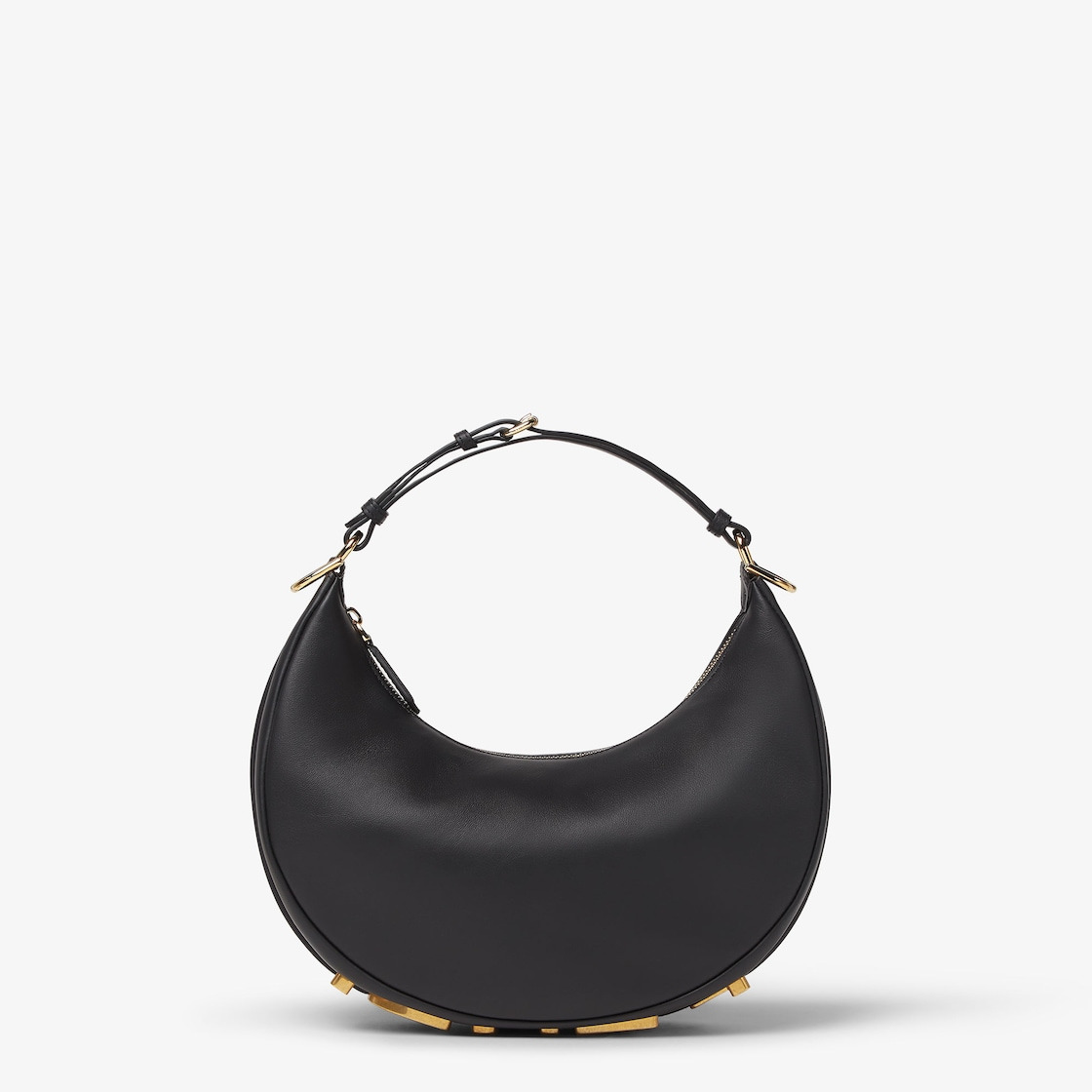 Small hobo bag made of soft black leather, with vintage gold metal FENDI lettering visible when the bag is worn under the arm. Zip closure with fabric-lined internal compartment, gold-finish metalware. Can be worn under the arm or cross-body thanks to the adjustable, detachable handle and the hooks that allow a shoulder strap to be attached. Made in Italy Measurements: - Height : 24.5 cm - Depth : 10 cm - Width : 29 cm - Weight : 0.7 kg - Shoulder strap drop : 18 cm Composition: 100% calf leather, inside: 63% cotton, 34% polyester, 3% acrylic Product Code: 8BR798A5DYF1HEJ