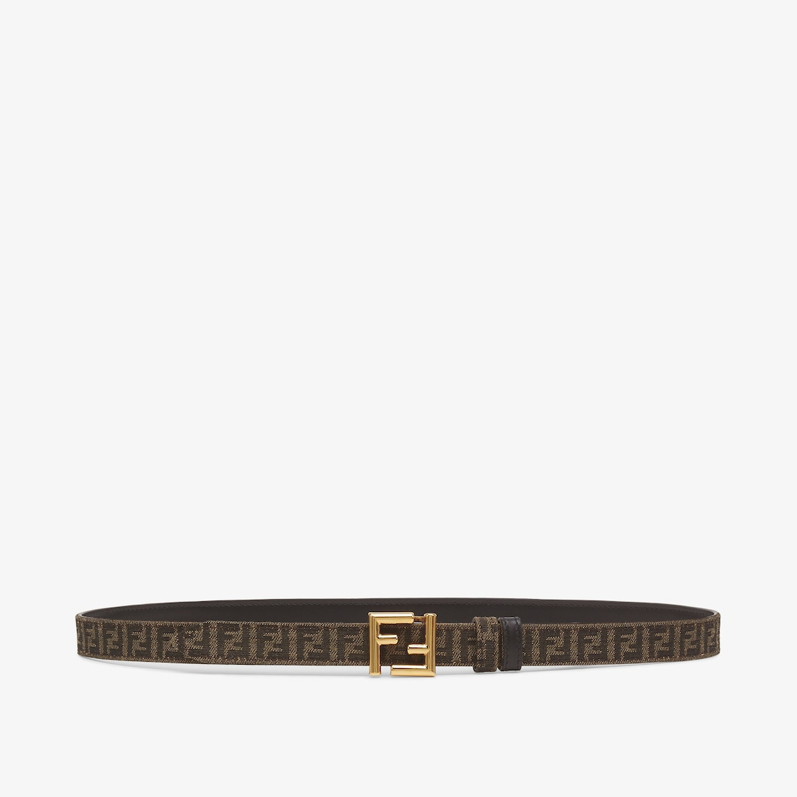 Reversible belt with loop and FF stud buckle. Made of black leather on one side and brown and tobacco FF jacquard fabric on the other side. Metal accessories in a vintage-gold finish. Made in Italy Measurements: - Width : 2 cm Composition: 100% calf leather, 62% polyester, 33% cotton, 5% resins Product Code: 8C0719ARN1F1OQ1
