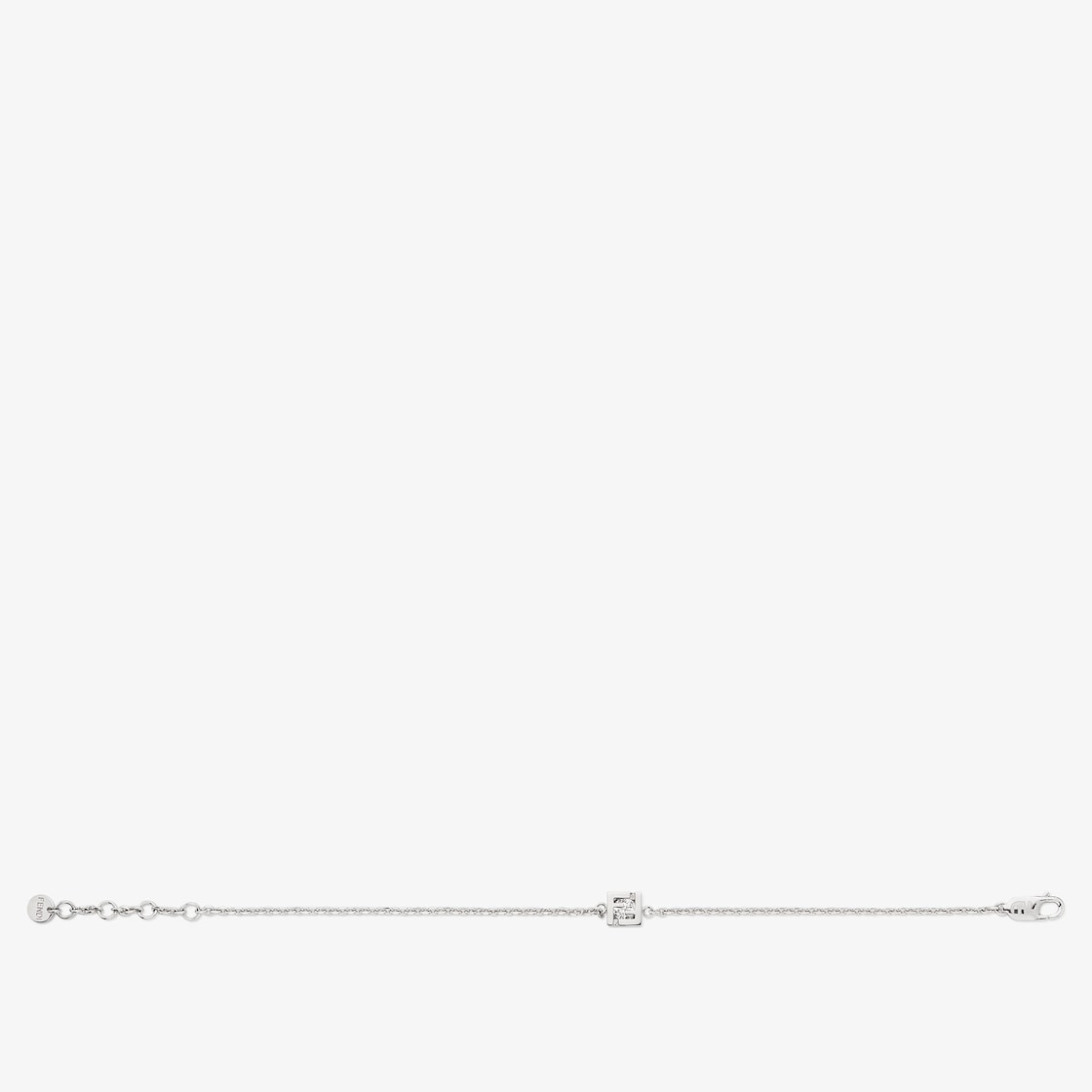 Chain-link bracelet with FF detail. Decorated with white crystal set in the double F. Made of palladium-finish metal. Made in Italy Composition: 100% brass, 100% cubic zirconia Product Code: 7AJ871A44GF035M Product Care: The product you have purchased may be embellished with a precious metal top or varnish and may also feature appliques, gemstones (in various shades of the same color), crystals, plexiglass or resin. The mixture of materials and the special details give this product its unique character. To best maintain the product’s appearance over time, avoid contact with sea water, spa water, lacquers, perfumes, solvents, chemicals and abrasive materials. If necessary, clean with water and a neutral soap and/or polish with a dry microfiber cloth.