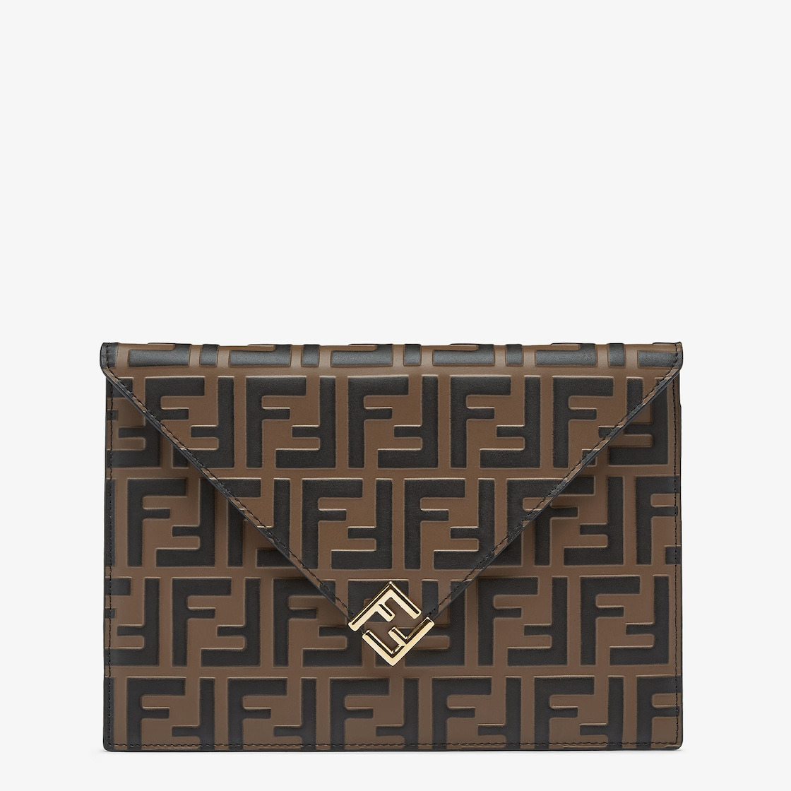 Large, slim pouch with geometric flap and diagonal FF logo. Snap closure. Made of brown leather with a black embossed FF print. Gold-finish metalware. Made in Italy Composition: 100% calfskin, inside: 100% calfskin Product Code: 8N0152ADYMF13VK