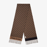 Scarf made of wool yarn and cashmere with an all-over black and tobacco jacquard FF motif. Embellished with Fendi Roma logo and fringes on the ends. Made in Italy Composition: 80% fleece wool, 20% cashmere Product Code: FXT113AQCWF0QE1