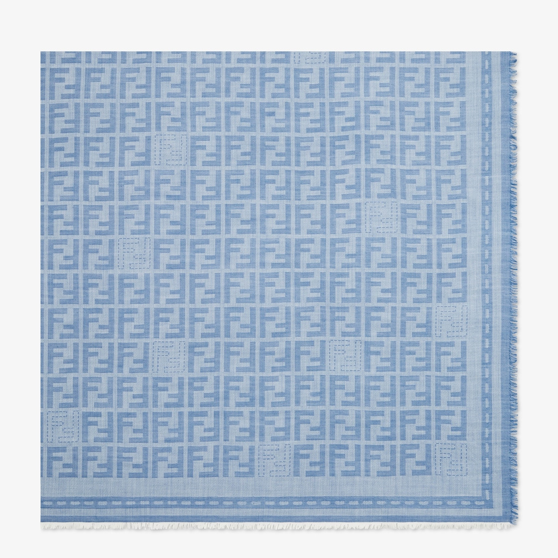 Large shawl made of soft, ultra-lightweight wool in denim blue. The exquisite jacquard creates an all-over FF logo. Embellished with details and frame inspired by Selleria stitching. Fringed borders. Suitable for all seasons. Made in Italy Composition: 100% wool Product Code: FXT069AUM1F0RU7