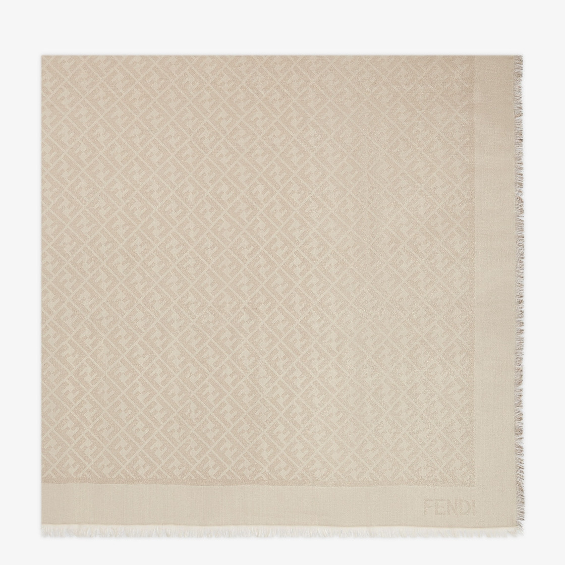 Large square shawl made in a soft, cream wool and silk blend embellished with metallic yarn, with the iconic tone-on-tone FF motif. Finished with hand-frayed hems. Made in Italy Composition: 45% wool, 45% silk, 7% polyamide, 3% polyamide Product Code: FXT069ANDBF0QJ6
