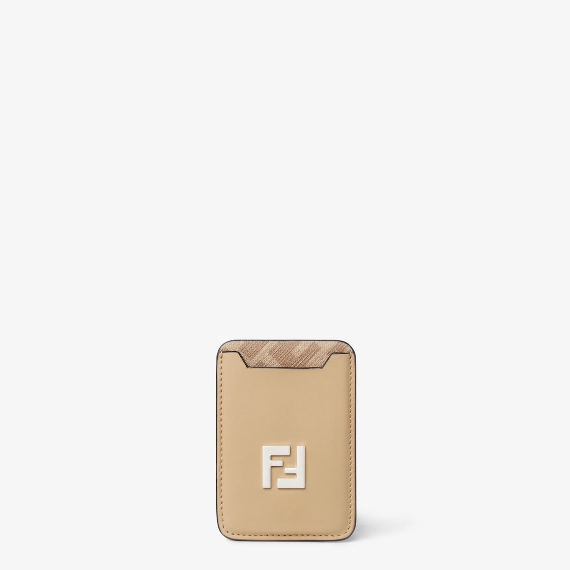 Card case with a central flat pocket that holds up to three cards using a magnetic system (MagSafe) on the back that sticks to your smartphone. Made of beige leather with beige FF Canvas details. Metal FF Squared motif with shiny palladium finish. Made in Italy Composition: 100% calf leather, 49% polyurethane, 28% cotton, 23% polyester, inside: 63% cotton, 34% polyester, 3% acrylic Product Code: 7M0364AV86F19VE