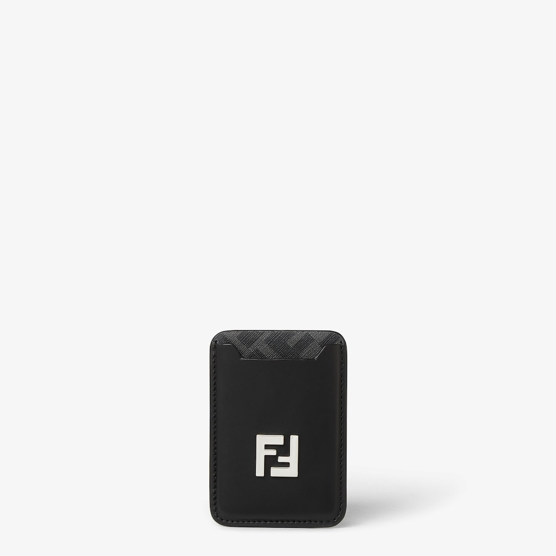 Card case with a central flat pocket that holds up to three cards using a magnetic system (MagSafe) on the back that sticks to your smartphone. Made of black leather with black FF Canvas details. Metal FF Squared motif with shiny palladium finish. Made in Italy Composition: 50% polyurethane, 28% polyamide, 12% cotton, 10% polyester, 100% calf leather, 49% polyurethane, 28% cotton, 23% polyester, inside: 63% co, 34% pl, 3% pc Product Code: 7M0364AFF2F0GXN