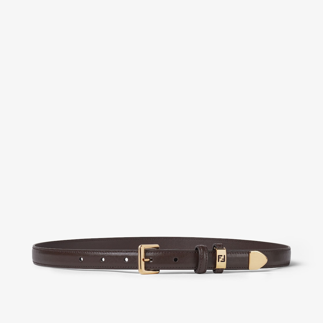 Slim belt with double loop and square buckle. Made of dark brown leather. Decorated with a metal FF logo tag on one of the loops. Gold-colored metal tip. Gold-finish metalware. Made in Italy Composition: 100% calf leather, inside: 100% calf leather Product Code: 8C0740ASUOF0L1B