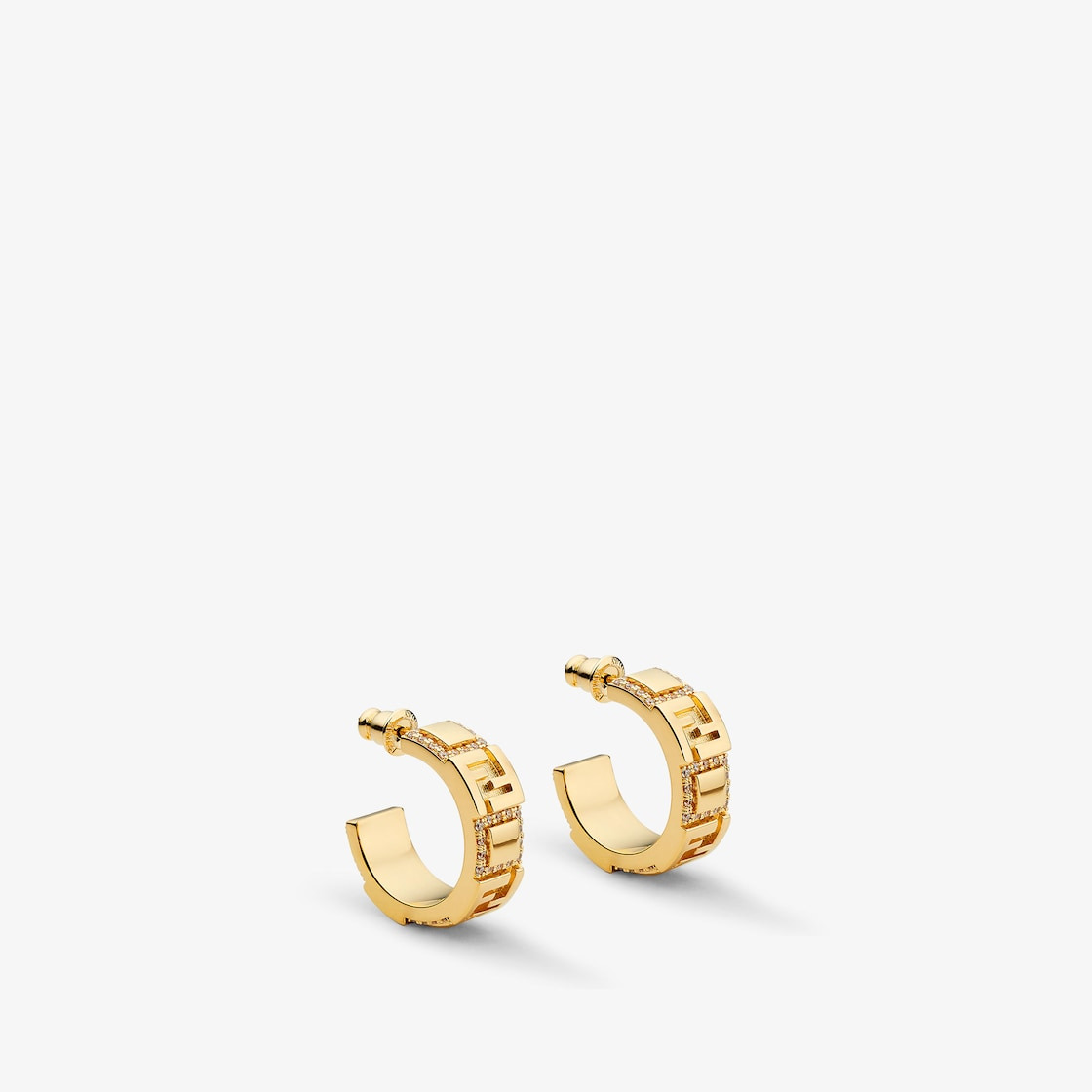 Small stud hoop earrings with embossed FF motif. Made of metal with a gold finish. Decorated with crystal bezels. Made in Italy Composition: 100% brass, 100% crystals Product Code: 8AK917ATEPF089U Product Care: The product you have purchased may be embellished with a precious metal top or varnish and may also feature appliques, gemstones (in various shades of the same color), crystals, plexiglass or resin. The mixture of materials and the special details give this product its unique character. To best maintain the product’s appearance over time, avoid contact with sea water, spa water, lacquers, perfumes, solvents, chemicals and abrasive materials. If necessary, clean with water and a neutral soap and/or polish with a dry microfiber cloth.
