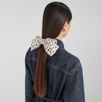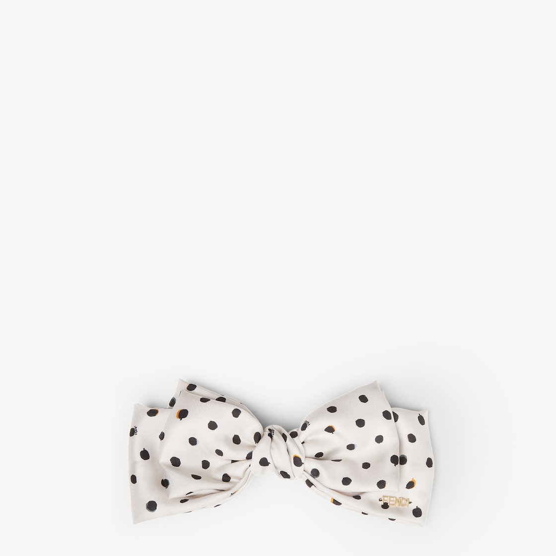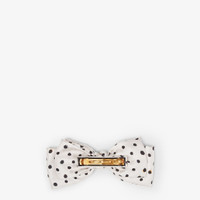Bow-shaped hair clip. Made of ivory silk printed all-over with the FF motif in black. Decorated with the Fendi Roma lettering in metal on the front. Gold-finish metalware. Made in Italy Composition: 100% silk, 100% steel Product Code: FXT138AWEYF17JU